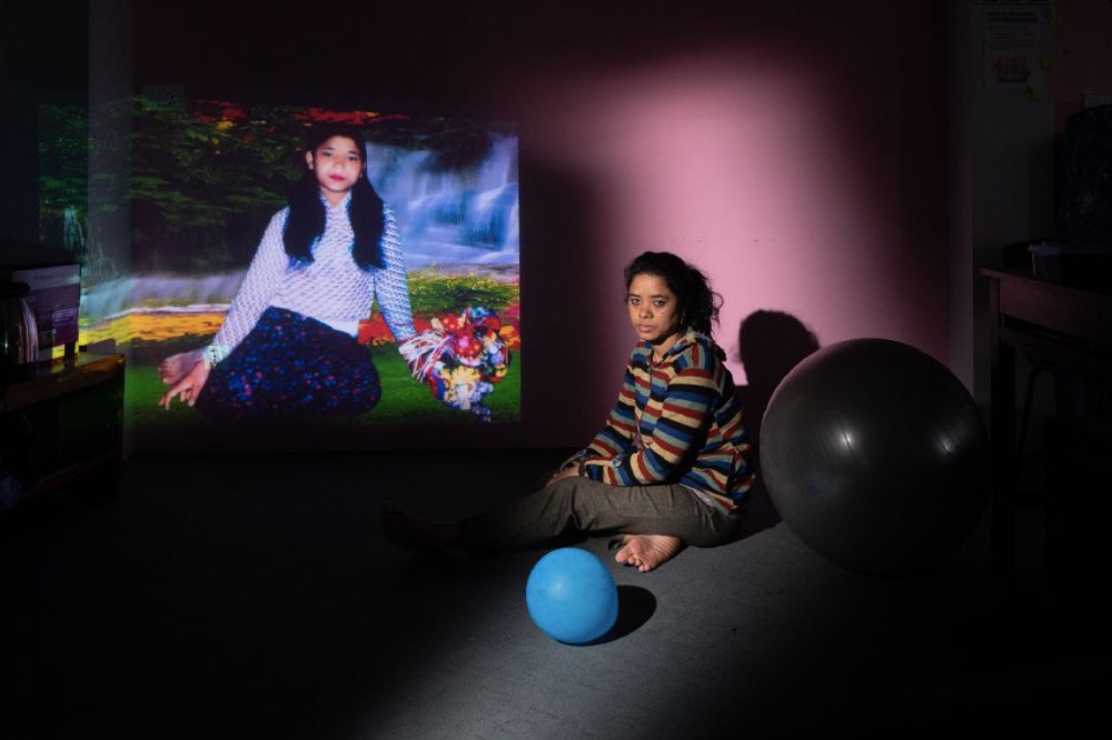 Bimala Dhakal poses for a portrait alongside the projected photo of her husband Rajendra Prasad Dhakal who was a human rights activist in Gorkha, and was disappeared in 1999 during a trip to Tanahu. She looked for her husband everywhere, and was herself arrested and tortured by the army. She never found him. Bimala rarely talks about her husband in front of her children, only when something reminds her of him.