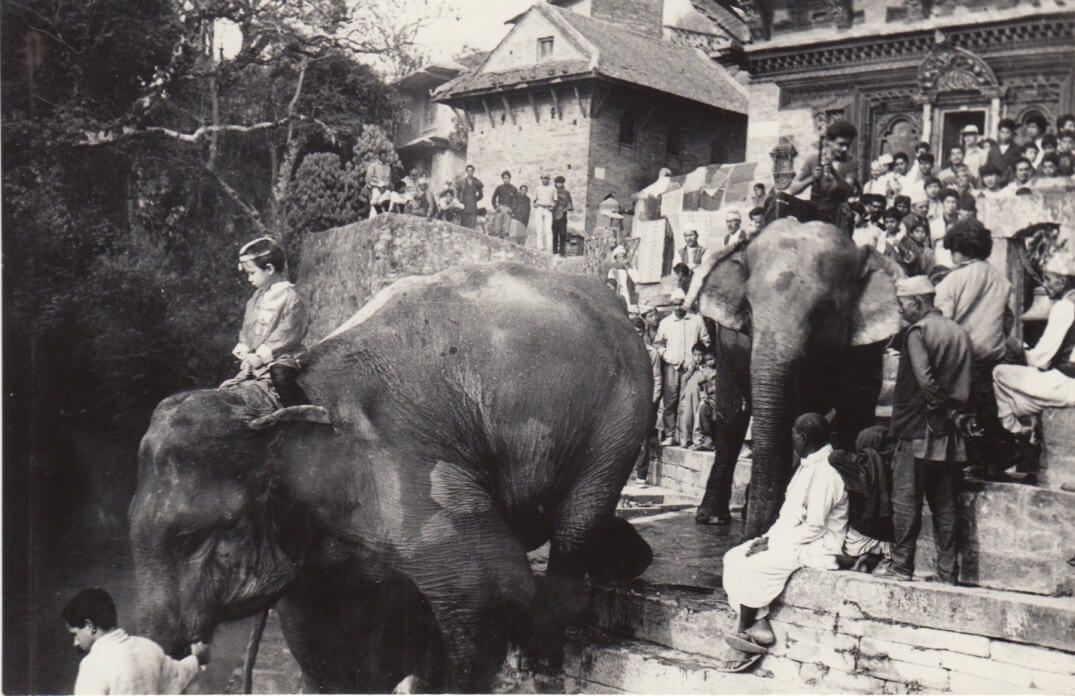 Inspired by Buddhist iconography and the Valley stupas’ all-seeing eyes, Temple and his wife Amanda had written a prescient mini-saga about an abandoned boy brought up by elephants, then driven into an unknown world by environmental destruction, where he would be hailed prince of truth, before retreating back into the jungle with his pachyderm dependents. “The Eyes of Truth are always watching you.” They asked me to arrange the film permit and logistics, as complex as any full-length feature, and to find the main character – a spiritual young boy with a generic Asian-Western look who was comfortable around elephants. That was easy. Both my sons Sangjay and Rinchen were at the British School in Kathmandu, and Malcolm McDougal was also put forward as a candidate – all boys blessed with an upbringing amongst the Tiger Tops elephant camps in Chitwan and Bardia. Four-year-old Rinchen, whose acclaimed Cowardly Lion in the kindergarten Wizard of Oz production had sparked acting aspirations, was thrilled to be selected. What could be better than to take two weeks off school, hang out with elephants, and be paid for it?