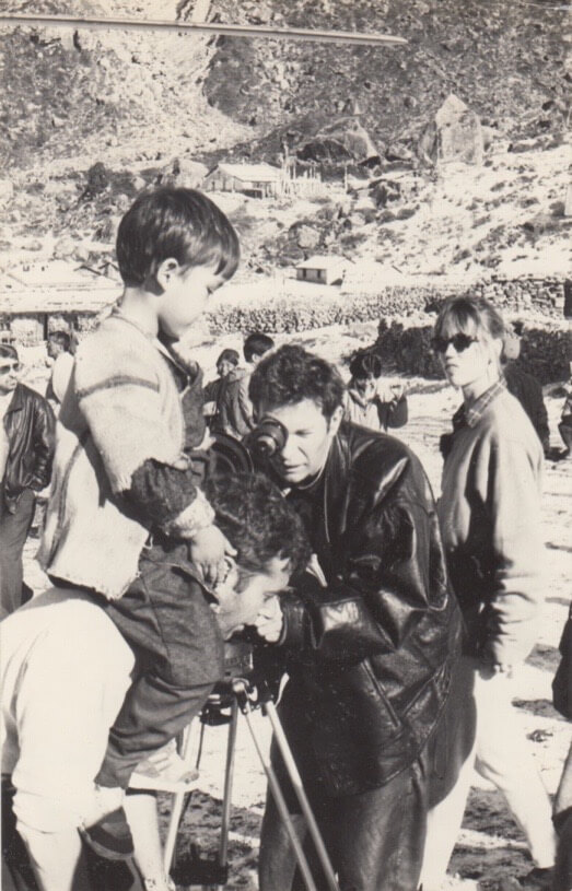The pristine air quality and unbuilt vistas of Kathmandu Valley of the early 1990s enabled us to select locations and deliver The Eyes of Truth storyboard as originally envisaged in Julien and Amanda’s script. Our film support team, fresh from months working on Little Buddha, swung into action. For the ten-day shoot, hundreds of skilled Newari artistes, Nepali musicians and Valley villagers were dressed and rehearsed, domestic elephants from Chitwan and Kathmandu were booked and briefed, and Rinchen’s costumes and jewelled headdresses were designed and prepared.