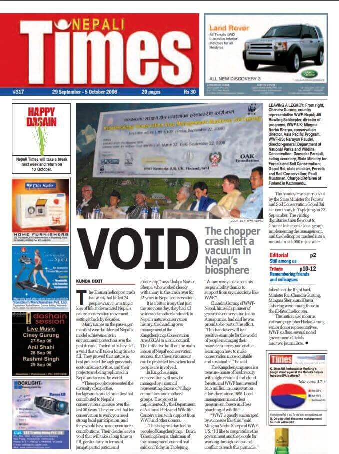 It was also a tragic reminder of another disaster 25km away in September 2006 in which 24 people were killed when a helicopter hit a mountain soon after takeoff from Ghunsa in bad weather. Nearly all of Nepal’s conservation pioneers perished, including Harka Gurung, Chandra Gurung, Mingma Sherpa, and Tirthaman Maskey. Jillian Bowling Schlaepfer and Jennifer Headley of the WWF also died, as did Pauli Mustonen, the Finnish charge d’affaires in Kathmandu (below).