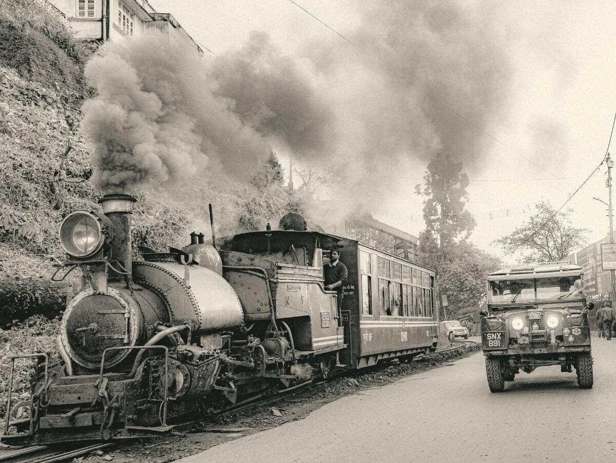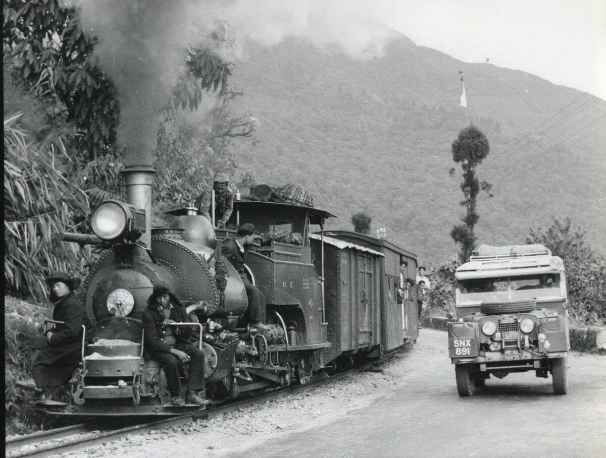 In Darjeeling’s famous Mane Bhanjyang, the vintage Oxford Land Rover posed (right) with the historic toy train just as it had in 1955 (left).