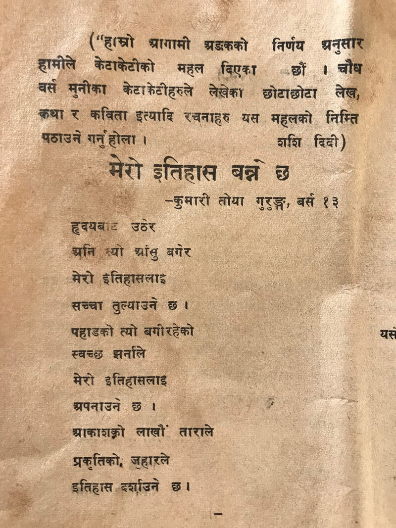 Toya Gurung: In 1971, Kedar Man Vyathit, who was the chancellor of Nepal Academy then, asked me to recite a poem. I had just graduated from Morang College in Biratnagar and was lucky to be part of a literary gathering there. I had recently written Shataabdi Pagleko Odaarsita Manche, a poem about my apartment, it was a small bedroom and a kitchen, and the kitchen walls and ceiling were completely black because I cooked with firewood. It felt like I was living in a cave, thus the title. Vyathit loved it and told me that he would publish a collection of my poems from Nepal Academy if I could bring him 50 of my poems.