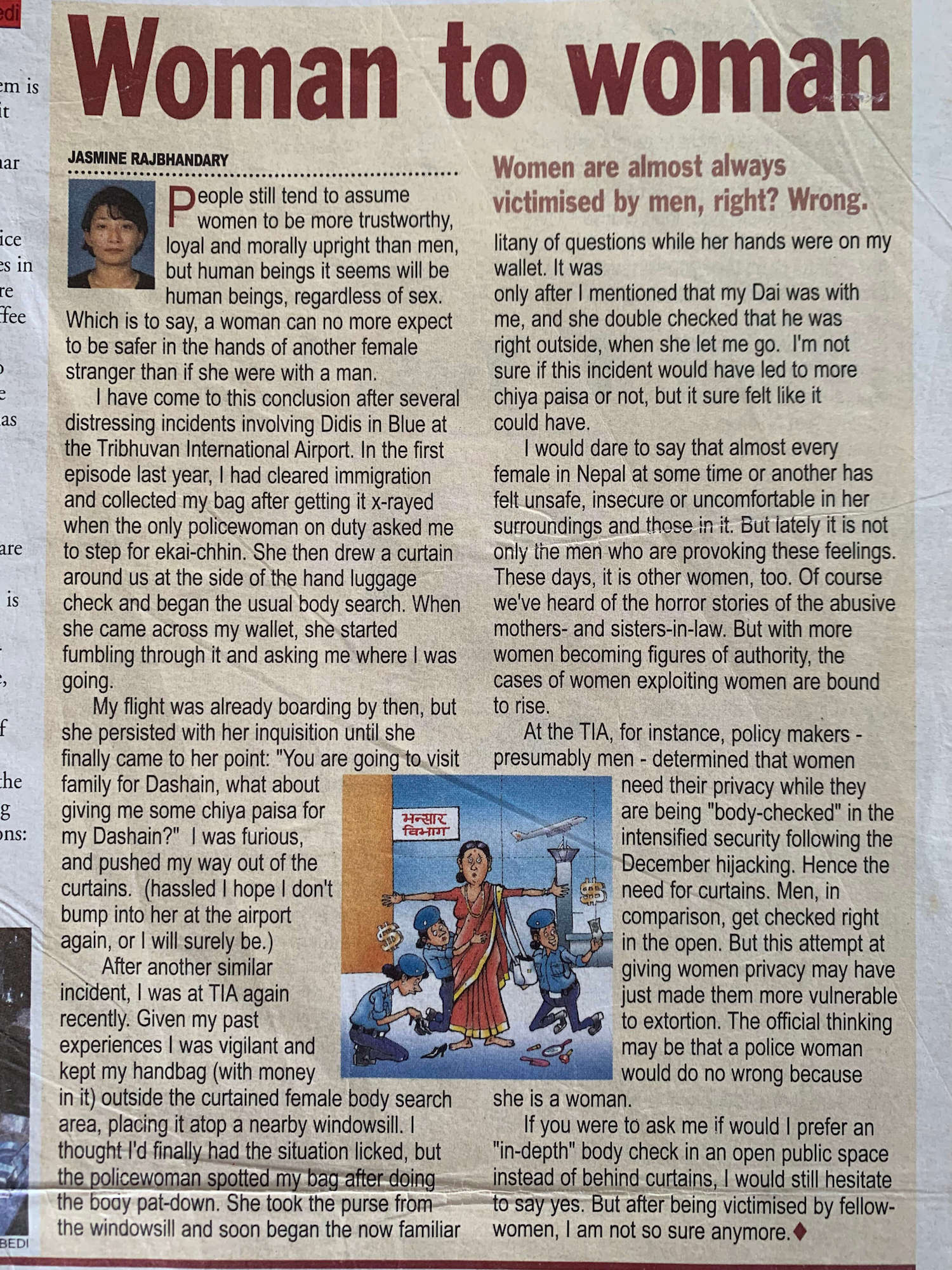 In the very first #0 prototype edition of this paper Jasmine Rajbhandary in her Women to Women column wrote about how female immigration officials at Kathmandu airport also extort female passengers: ‘I would dare to say that almost every female in Nepal at some point or another has felt unsafe, insecure or uncomfortable in her surroundings and those in it.’