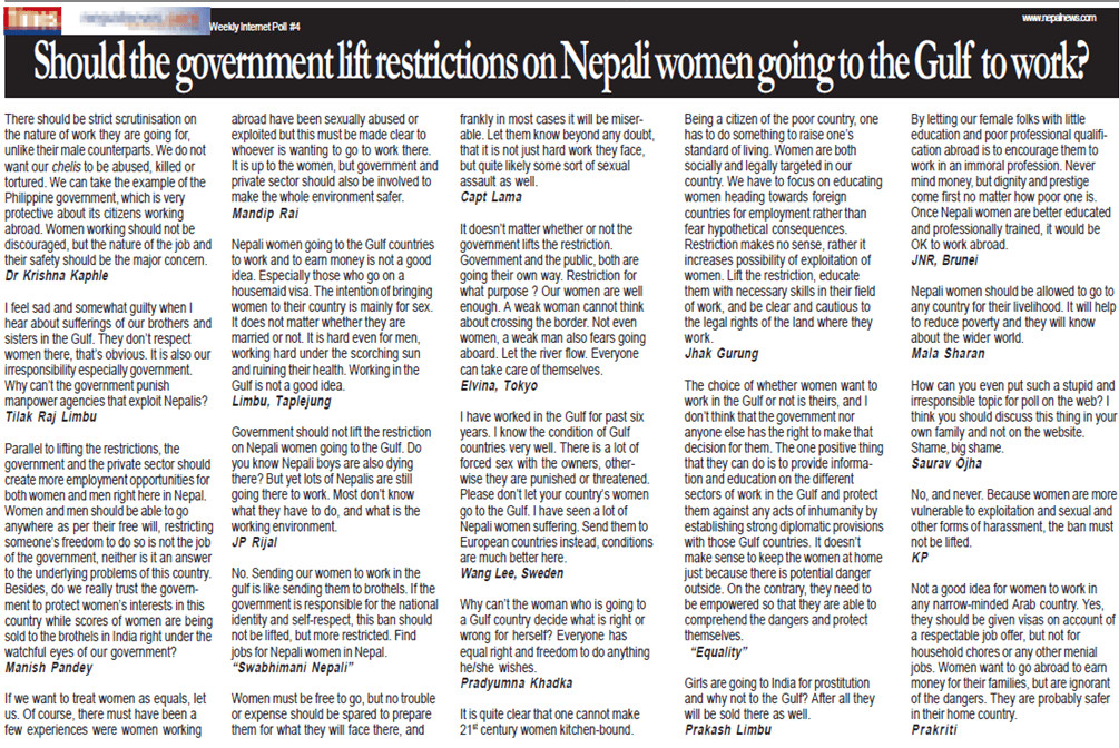 In its 19 October 2001 issue, Nepali Times conducted an online reader poll on whether the government should lift restrictions on Nepali women going to the Gulf to work. Nearly 1,000 people responded, with over 60% saying yes. It showed that this has always been a contentious issue. Some of the responses are quite revealing (see screenshot).