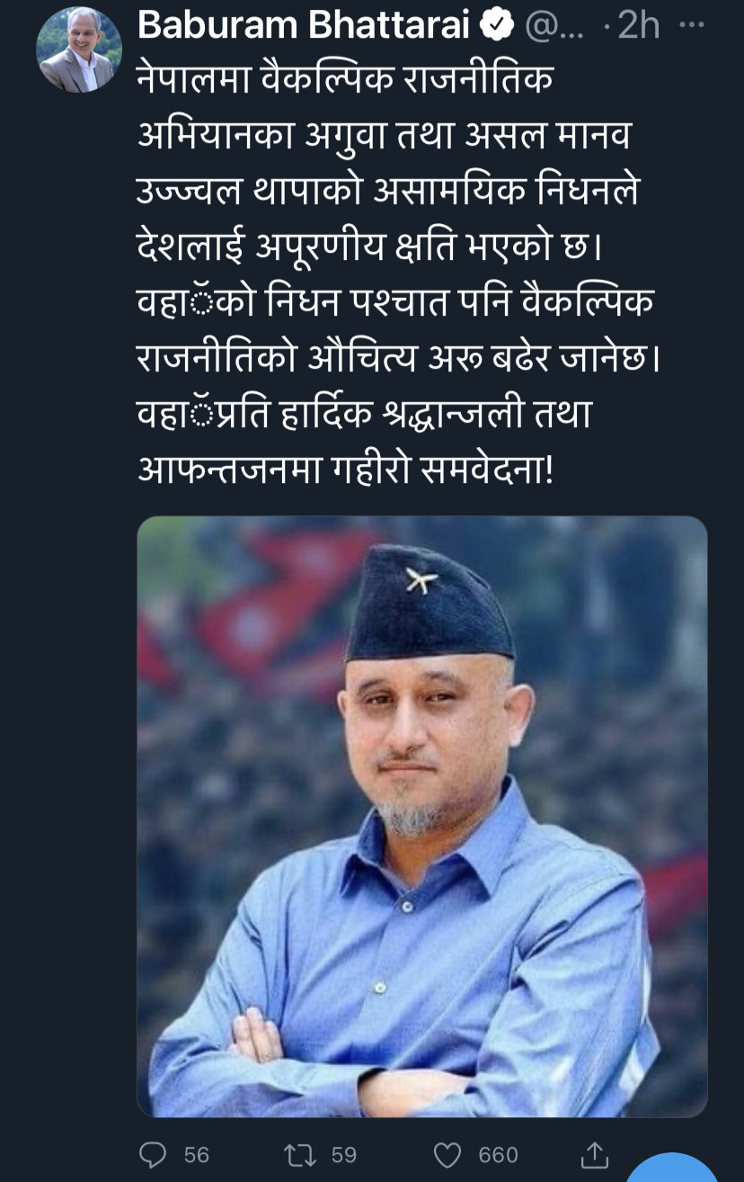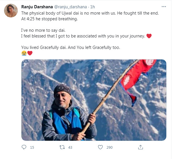 One of them was Ranju Darshana whom Bibeksheel fielded as a candidate from Kathmandu. She tweeted on Tuesday: ‘The physical body of Ujwal dai is no more with us. He fought till the end. At 4:25 he stopped breathing. I’ve no more to say dai. I feel blessed that I got to be associated with you in your journey. You lived gracefully dai. And you left gracefully too.’