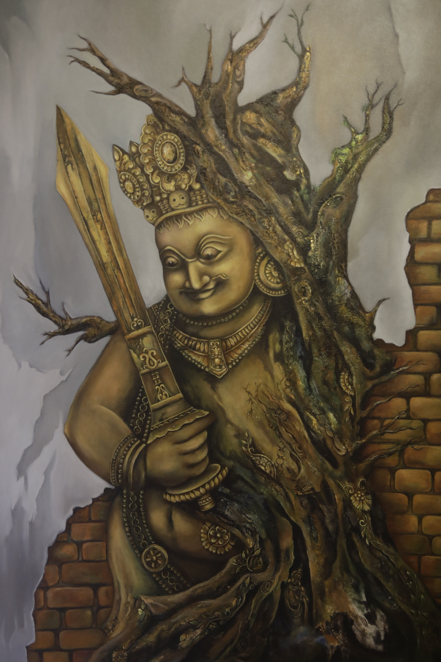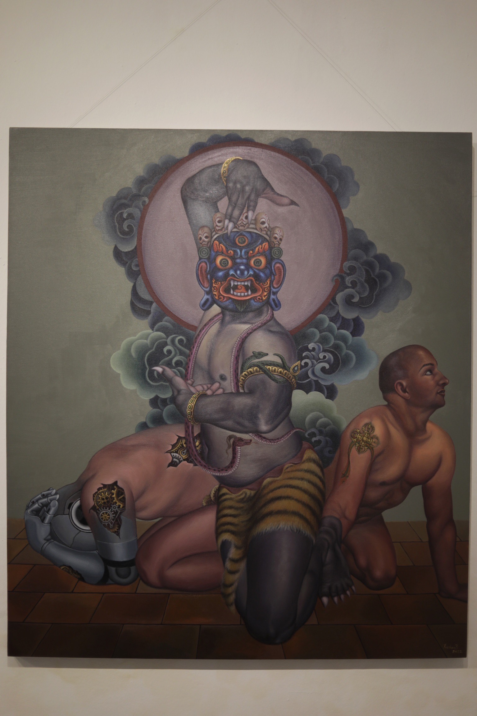 Right after entering Siddhartha Art Gallery, a large painting immediately catches the eyes of visitors. ‘Modern Rawan’ an acrylic on canvas by Roshan Pradhan shows a naked figure, orange and brown, crouching with one hand under its chin.