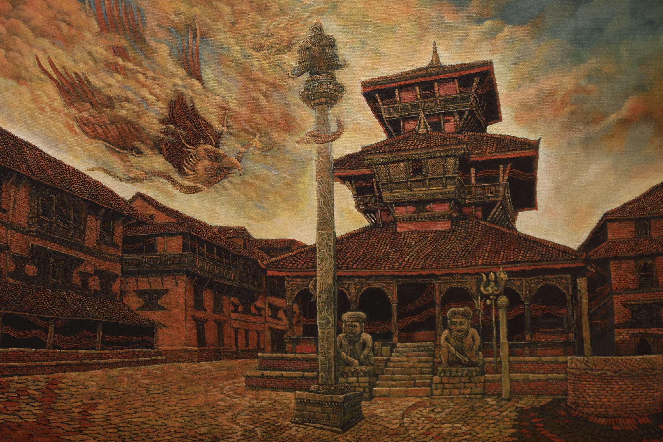 A striking example of this is Pradhumna Shrestha’s ‘Shangrila’ series, which focuses on architectural and material space. His paintings depict the Darbar squares of Kathmandu Valley, as seen through a fiery lens, with delicate accuracy.