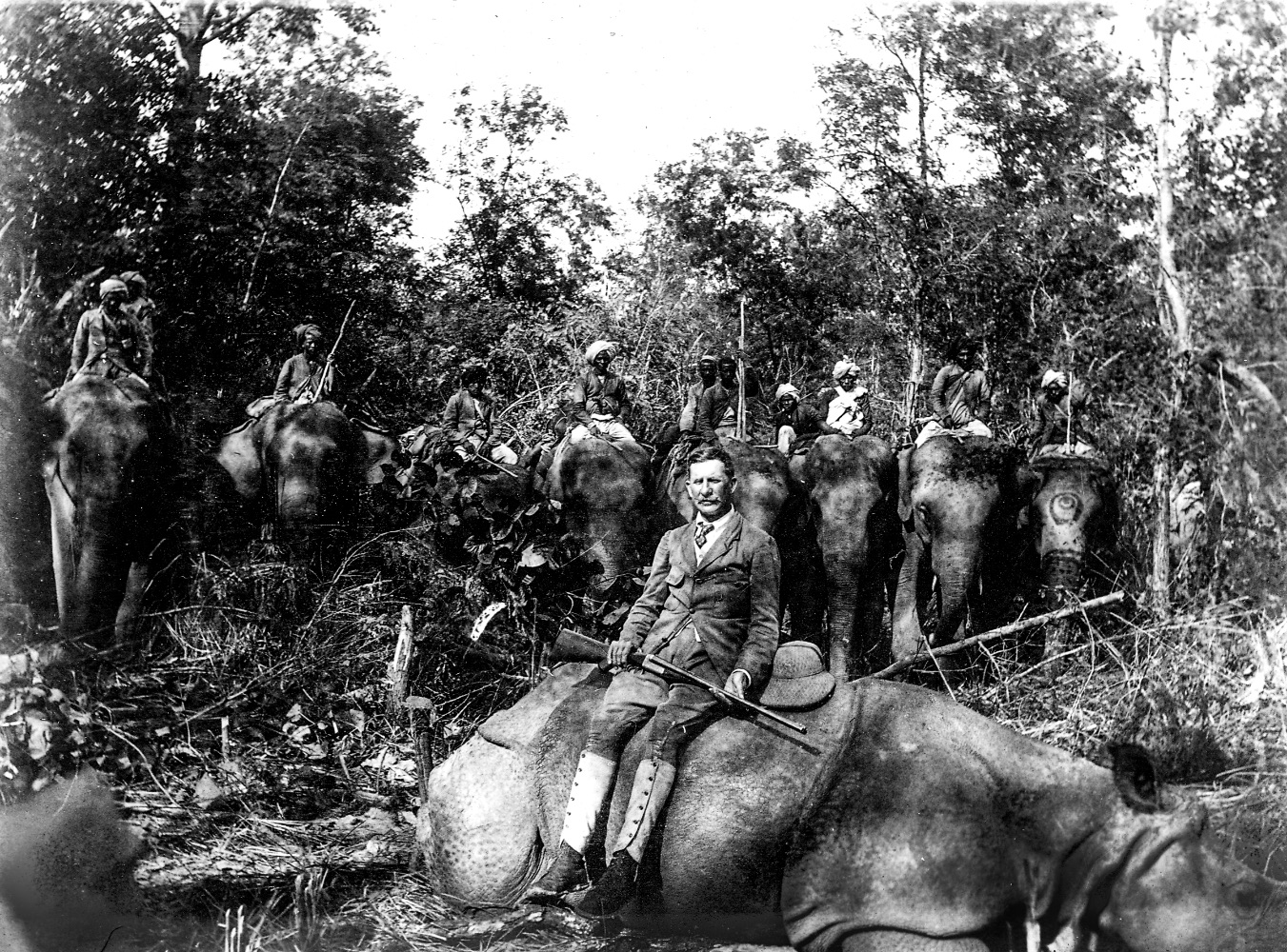 Rana hunting expeditions couldn't have happened without expert Tharu mahouts, as this 1913 photo (above) from a hunt connected to Tribhuvan's coronation shows. But Tharus themselves rarely hunted. Instead they farmed, grazed cattle and buffalo, fished, trapped small animals, and gathered herbs and other resources from the grasslands and forests.