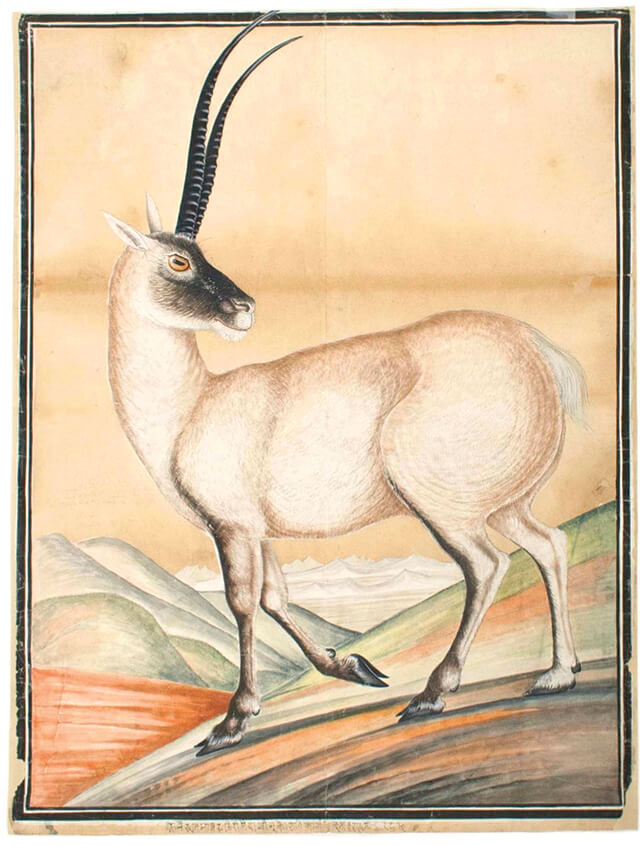 It turns out that although the painting was by a Nepali artist, the chiru antelope was not from Nepal at all. In his book the Prisoner of Kathmandu: Brian Hodgson in Nepal, Charles Allen (who died last week at the age of 80) says the antelope was in fact reared at a monastery in Tibet of the Tashi Lama, the second spiritual leader after the Dalai Lama.