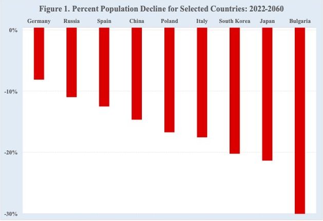By 2060, for example, those projected population declines include 9% in Germany, 11 in Russia, 13 in Spain, 15 in China, 17 in Poland, 18 in Italy, 21 in South Korea, 22 in Japan, and 31 in Bulgaria (Figure 1).