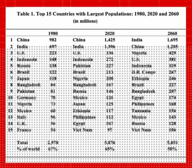 For example, while in 1980 about half of the 15 largest country populations were developed countries, by 2020 that number declined to one country, the United States. Also, Nigeria, which was eleventh largest population in 1980, was the seventh largest in 2020 and is projected to be the third largest population in 2060 with the United States moving to fourth place (Table 1).