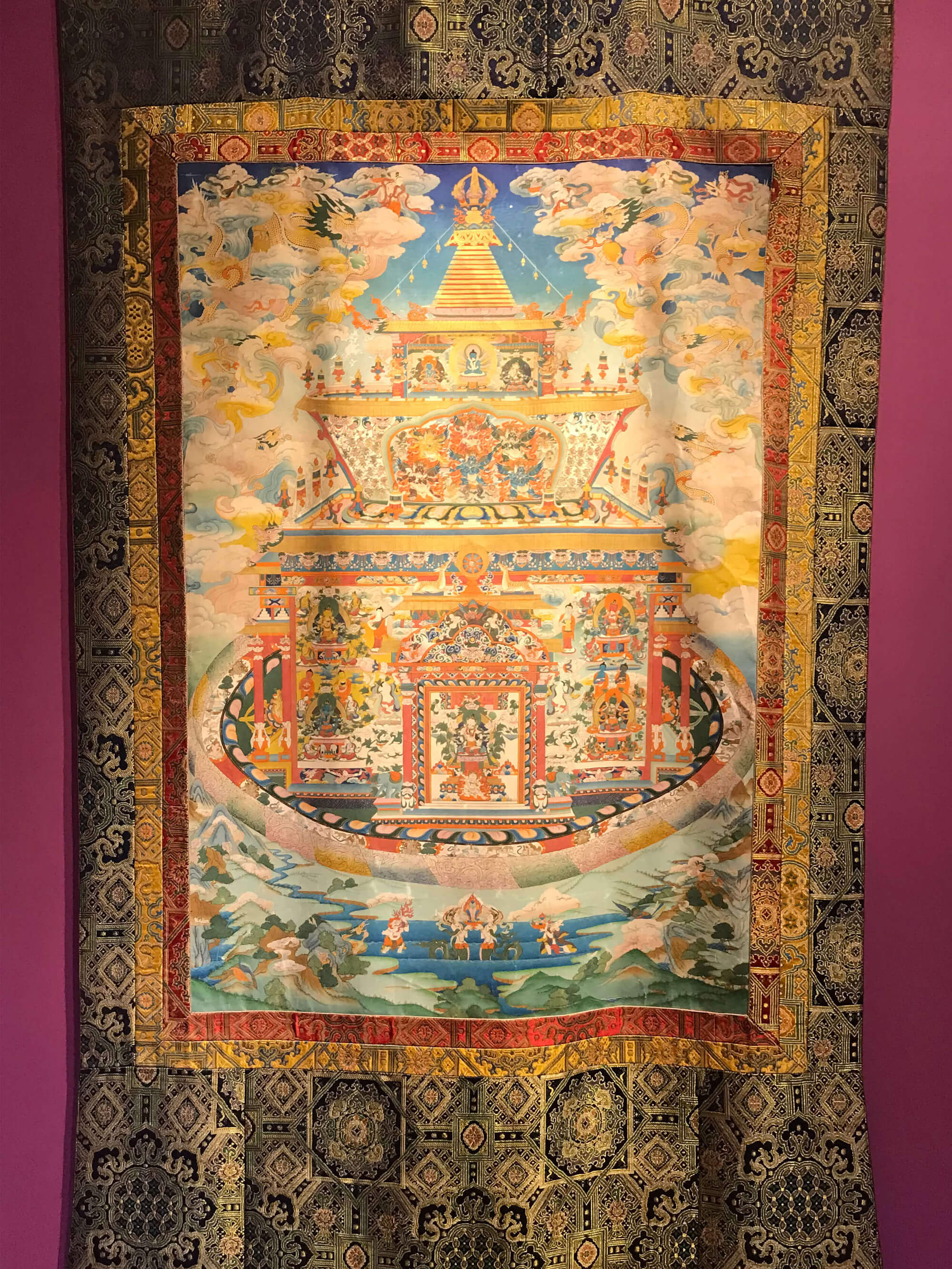 The mandala rises laterally instead of the usual circular structure, as seen from above, and depicts the tantra concerning life and death.