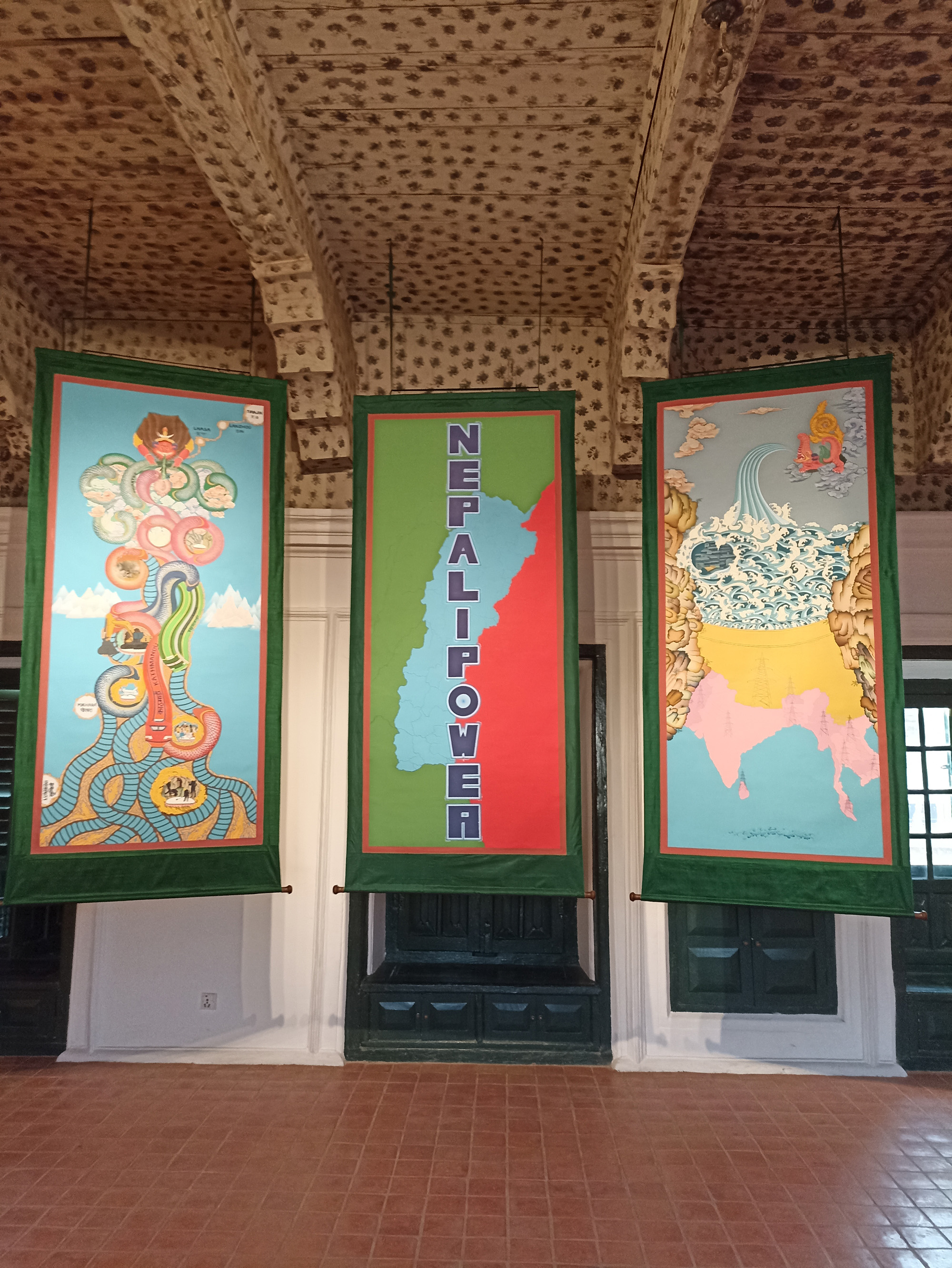 Nepali Power by Köken Ergun and Tashi Lama (pictured above) is a collaboration between Istanbul, Kathmandu and Bhaktapur, inspired by the Belt and Road Initiative (BRI) set forth by China in 2013 to build global connectivity. The vibrant triptych hangs gloriously in the middle of the room, depicting rich possibilities and precautions.