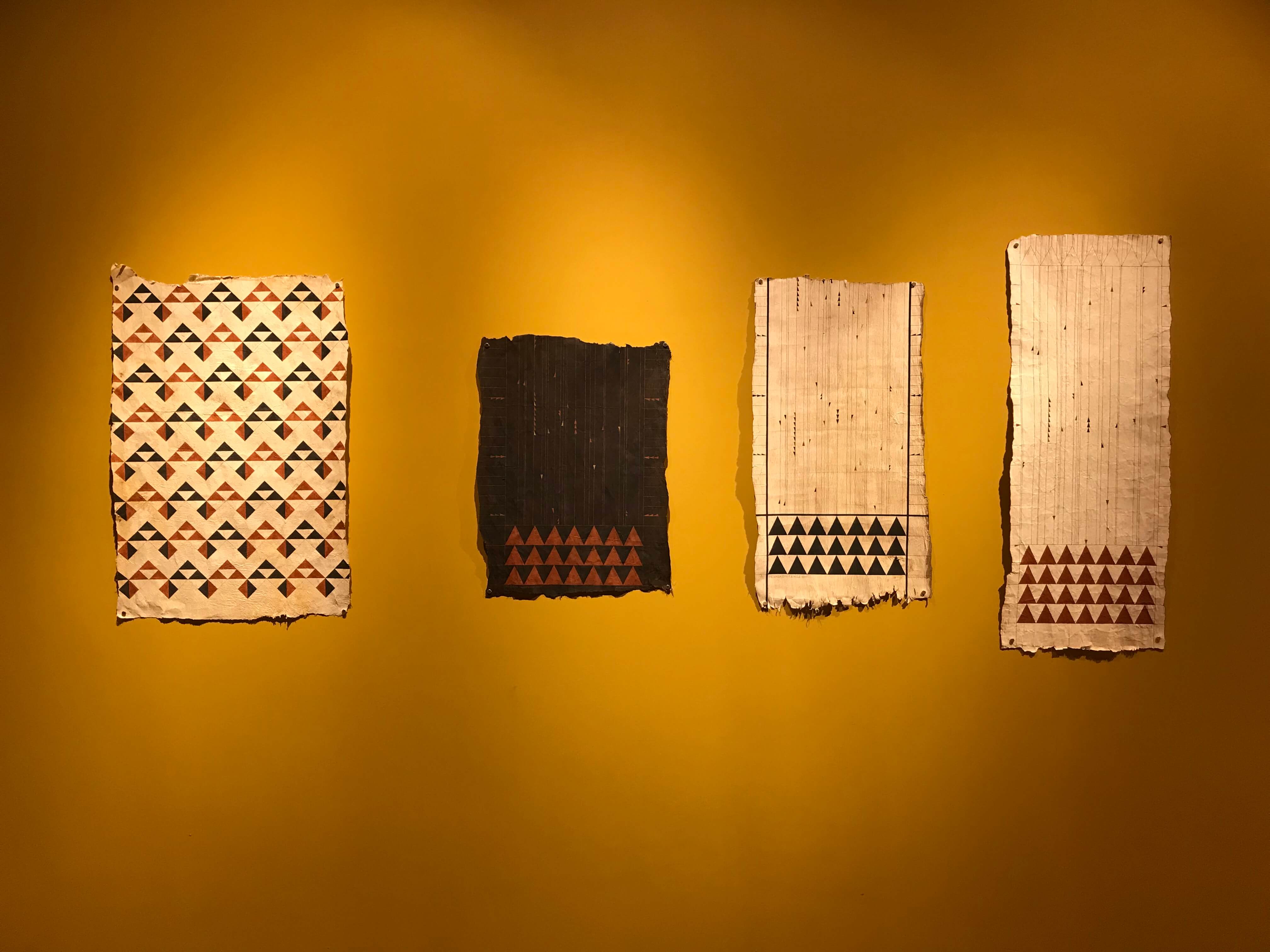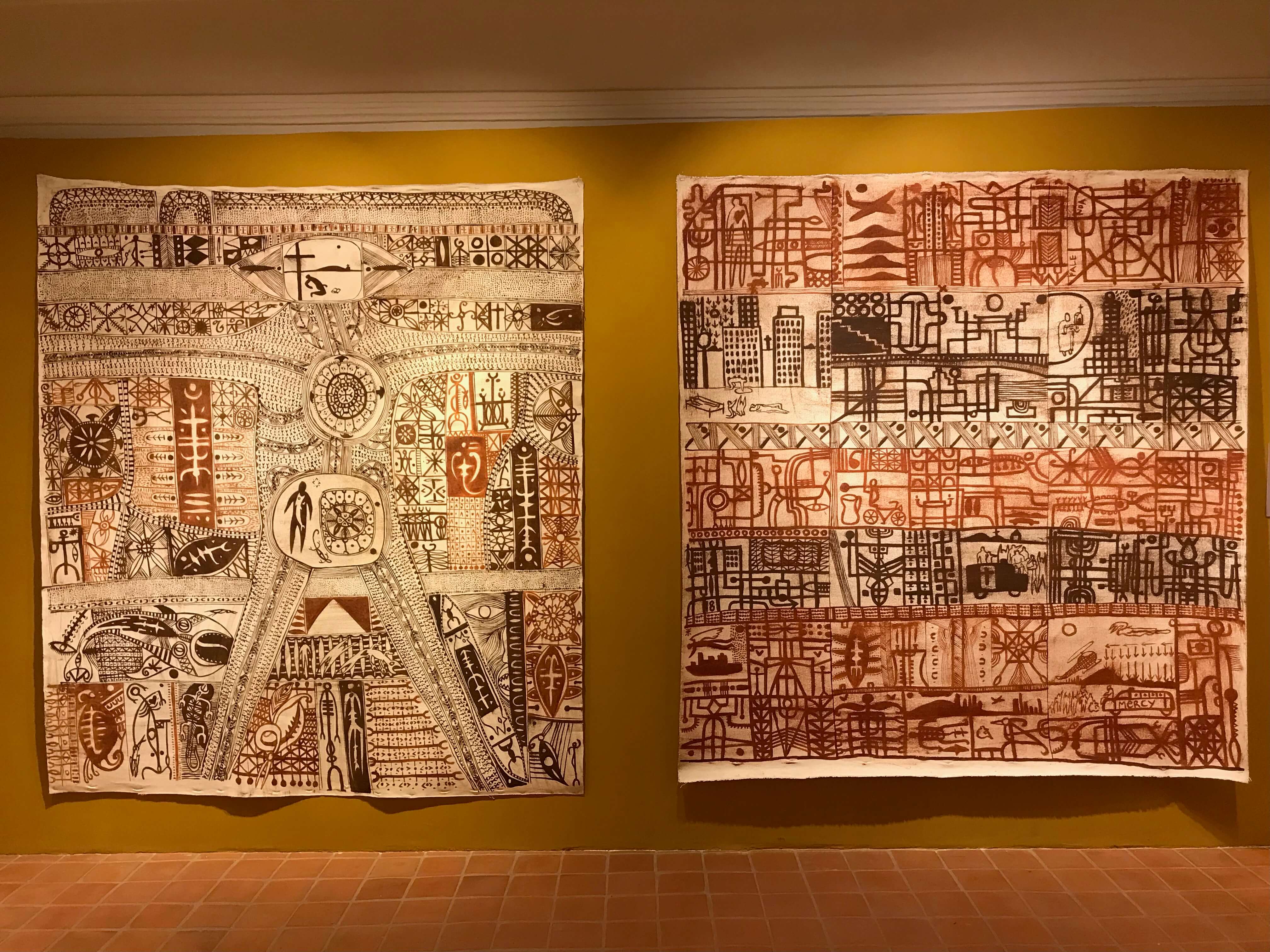 Meanwhile on the wall opposite sits Untitled by Mary Dhapalany, from Ramingining, Northern Territory in Australia (detail pictured below, left). A weaver and an actress, Dhapalany work is rooted in the Yolŋu’s traditional nganiyal (woven mats) that have deep ritual, ceremonial and practical significance.