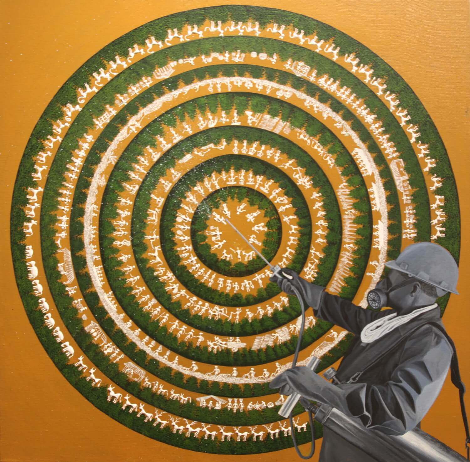 They are three canvases titled DDT depicting circles within circles in the first one. Chakra, the circle of life, but it is also a bullseye, and the tiny figures of animals and people are rendered in the style of a traditional Tharu folk art. The figures are the size of an adult mosquito, and a greyscale exterminator points directly at the centre of the target, ready to spray dichlorodiphenyltrichloroethane.
