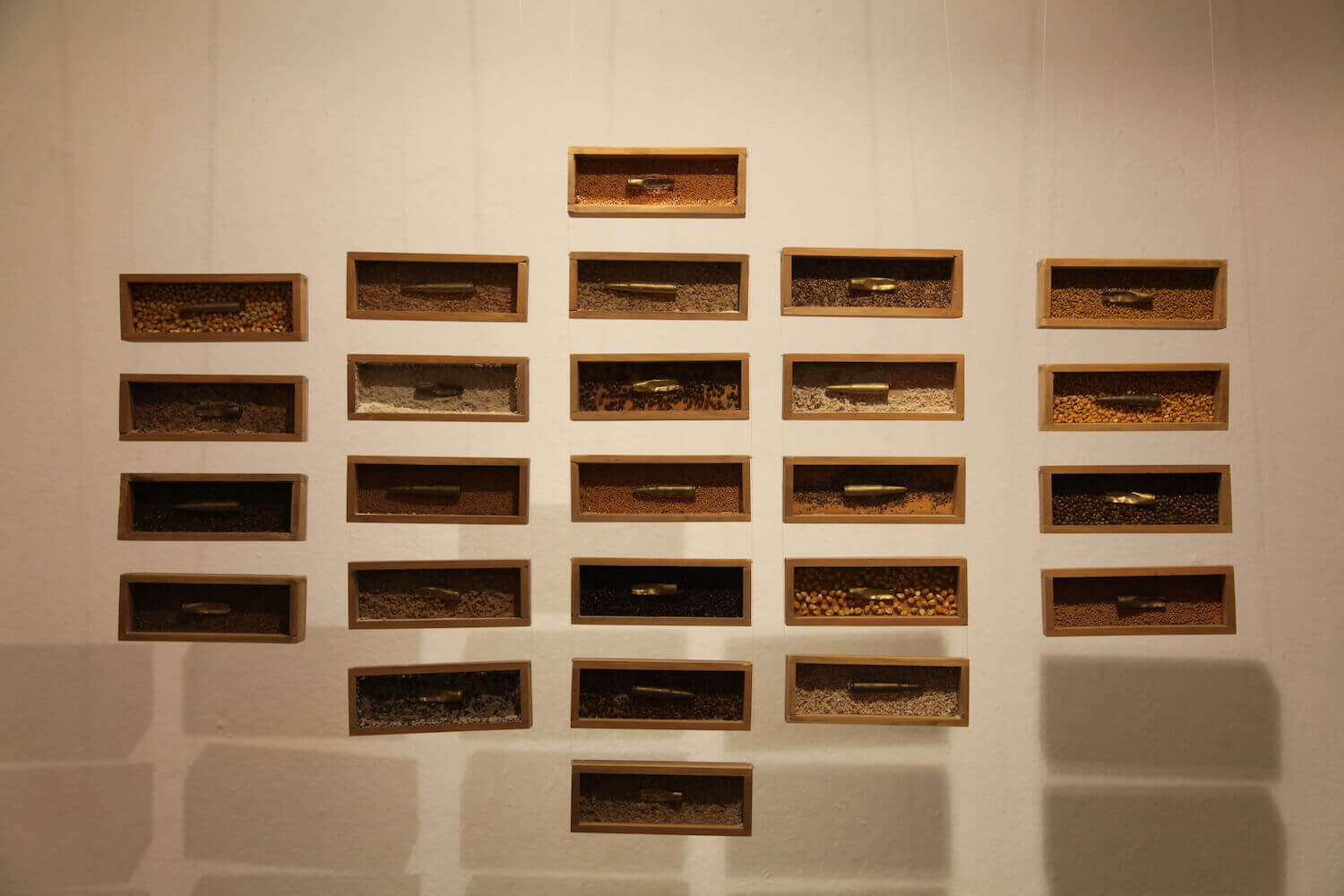 One of Chaudhary’s art installations is of small wooden boxes hung from the ceiling, each filled with grain and a single brass bullet. Next to it, the Diary series recreates pages carved into wood from the diary of Jokhan Ratgainya, a Tharu journalist and revolutionary who was killed in June 2001.