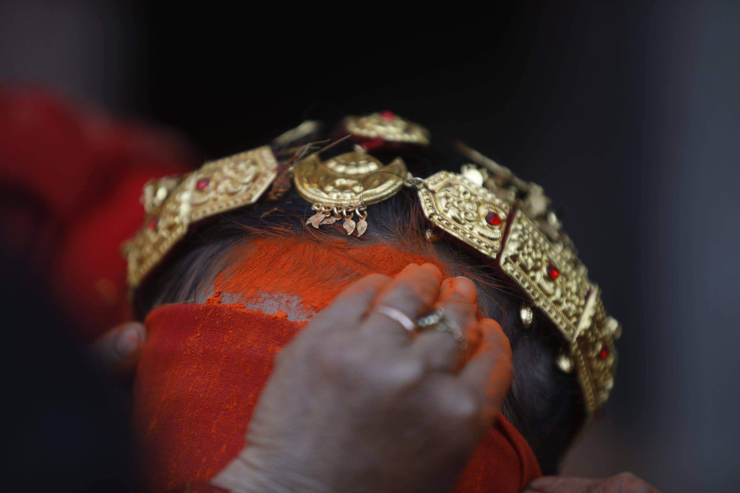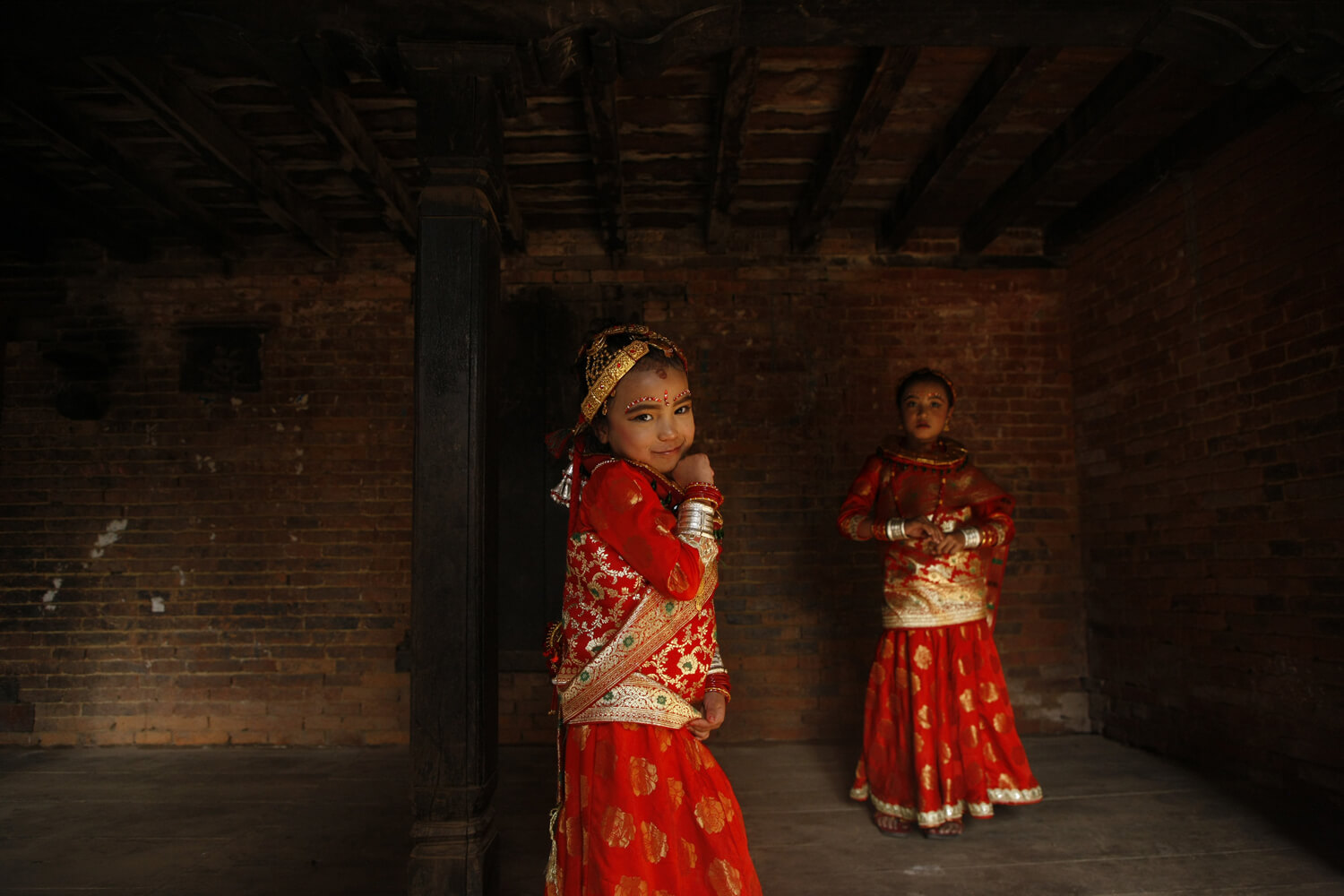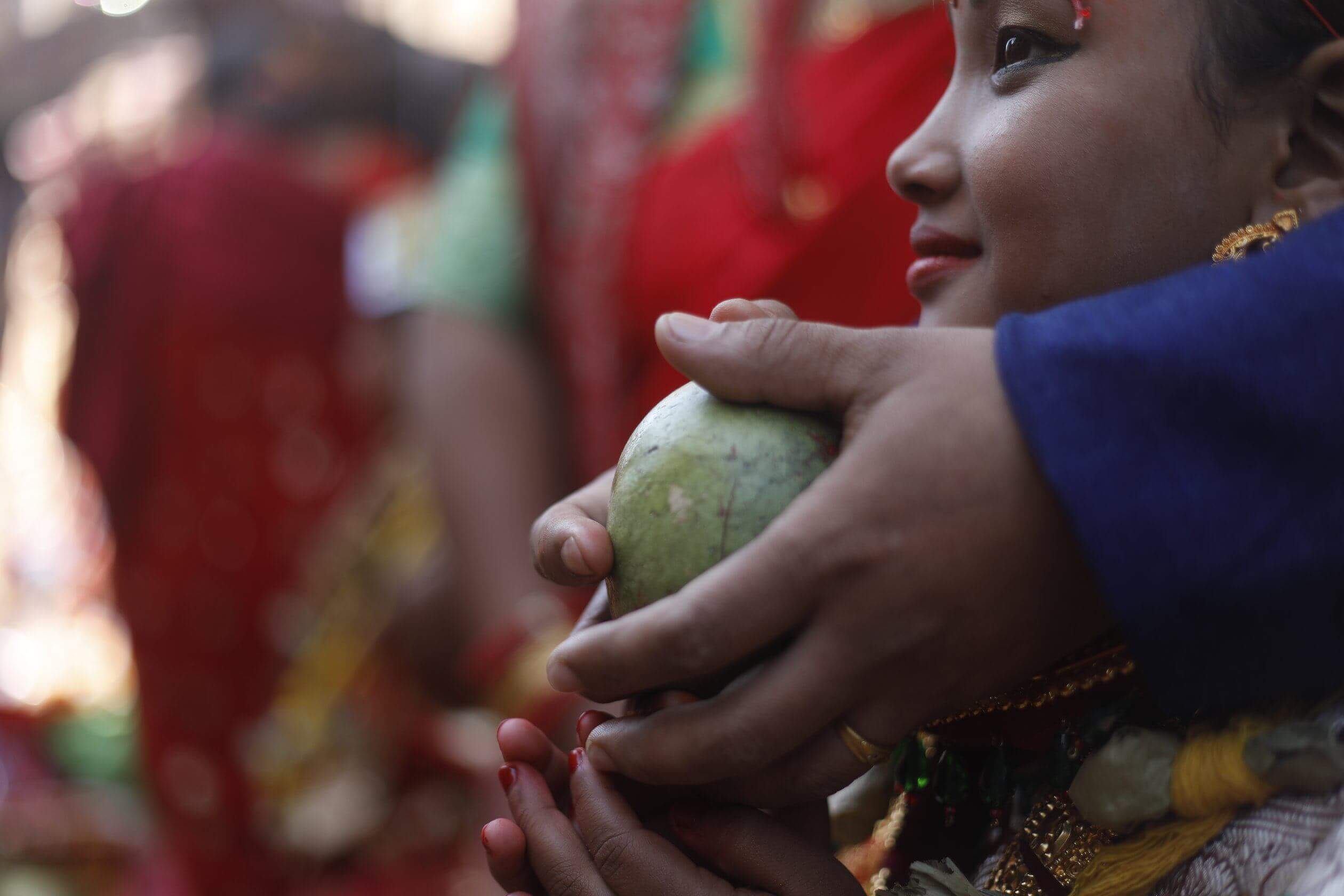 Girls from the Newa community in Nepal get married at least three times in their lifetime. The first ceremony called Bel Bibaha (‘Ihi’) is where pre-adolescent girls are married symbolically to a bael fruit (wood apple). The wild fruit is considered a symbol of the Lord Vishnu.