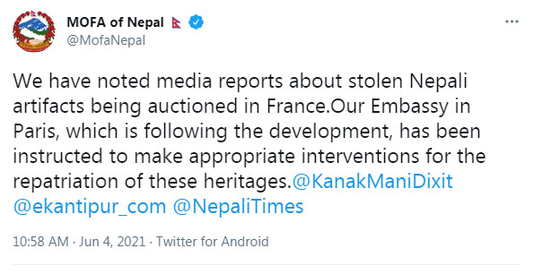 Nepali Times had reported on the auction sale on Thursday, and this had been followed by Nepal’s Ministry of Foreign Affairs and the Nepal office of the Paris-based UNESCO to put pressure on Bonhams and the French government to return the objects.