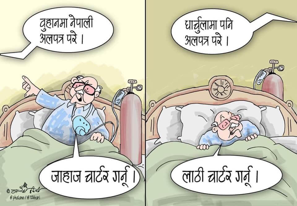 Nepalis stranded in Wuhan. Charter a plane! Nepalis also stranded in Dharchula. Lathi charge them! Cartoonist: PHALANO/BARHAKHARI