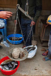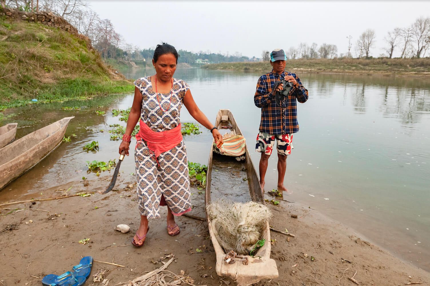 The women unload the fish, weigh and sell them to the men who have gathered to inspect the evening catch. They are regular customers, mostly hotel and restaurant owners from Sauraha who wait around for the boats to return. They can resell the fish at triple the cost price in town. Within minutes, the entire lot is gone. It has been a good day.
