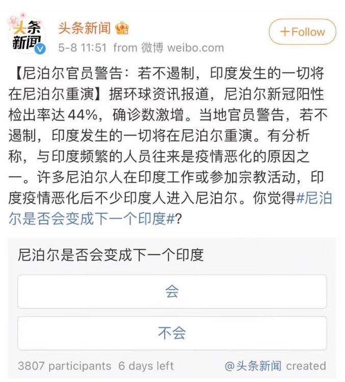 Indeed, the hashtag #尼泊尔是否变成下一个印度 (translation: “Will Nepal become the next India’) got over 80 million engagements and counting this week. On 8 May, Toutiao News, a major information portal followed the popularity of the hashtag and ran a rather unusual week-long poll asking Chinese netizens' opinion on whether ‘Nepal will become the next India’.
