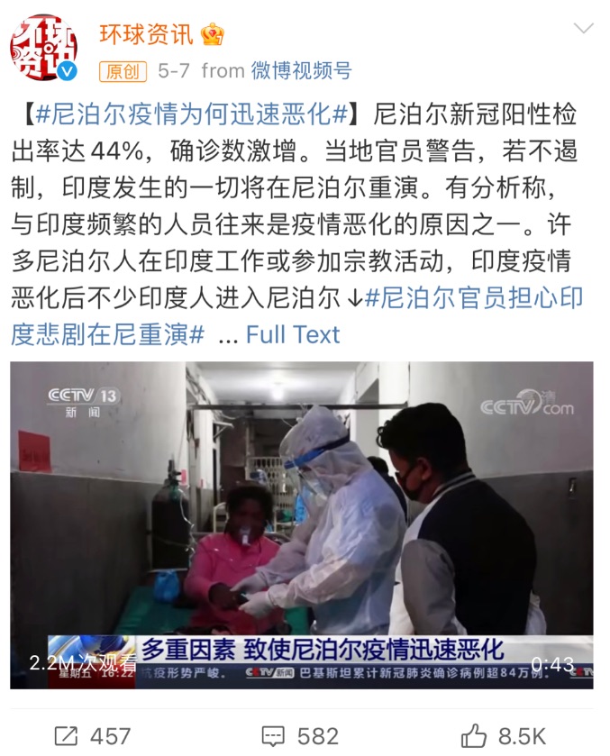 One of the most prominent hashtags, #尼泊尔疫情为何迅速恶化 (translation: ‘Why the pandemic is rapidly worsening in Nepal’) gained 55 million engagements in 24 hours this week. Even though the hashtag concerns Nepal, most of the posts and replies using it centred around India’s failure to contain the second wave.