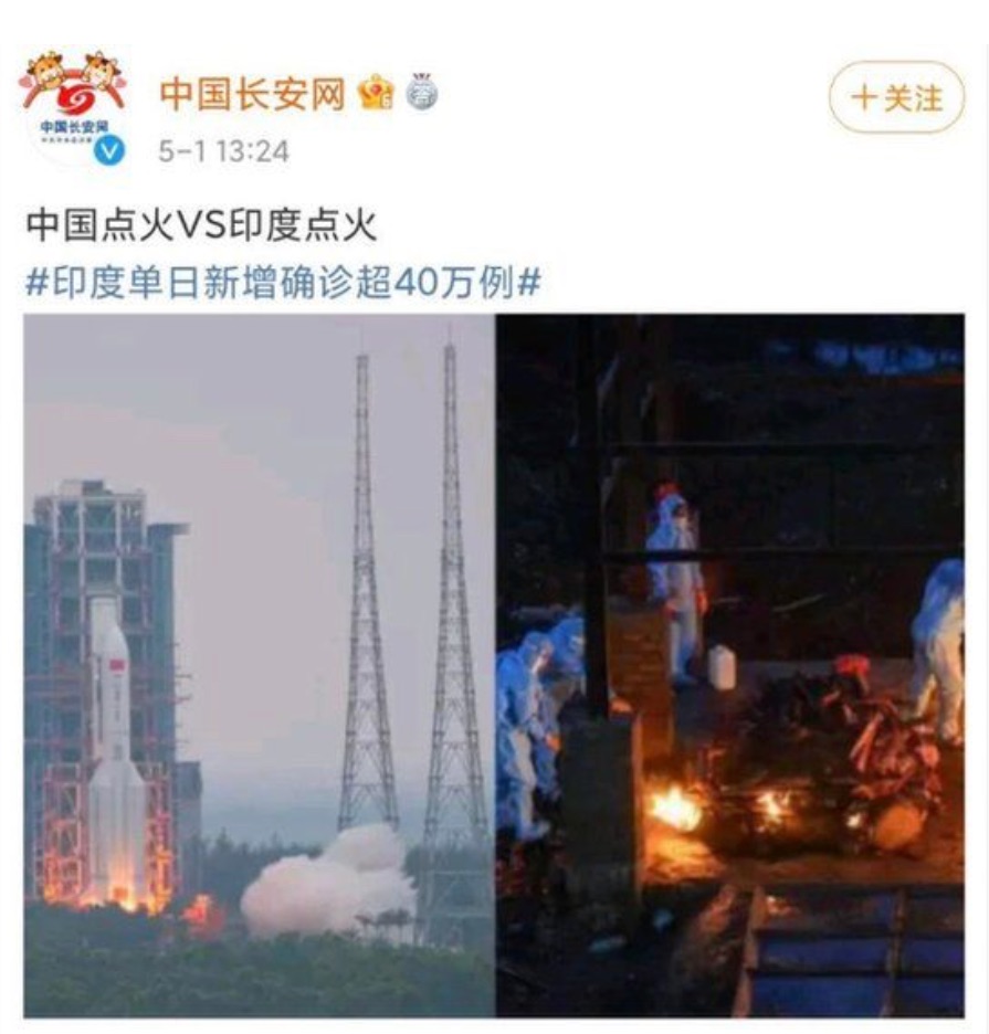 Some deliberately derogatory posts that seemed to rejoice in India’s tragedy were taken down after outrage on social media. One post tagging ‘China Lighting a Fire’ showing China’s rocket launch last week side-by-side with ‘India Lighting a Fire’ showing a mass-cremation site in Delhi drew so much backlash from Weibo users inside and outside China that it was deleted.