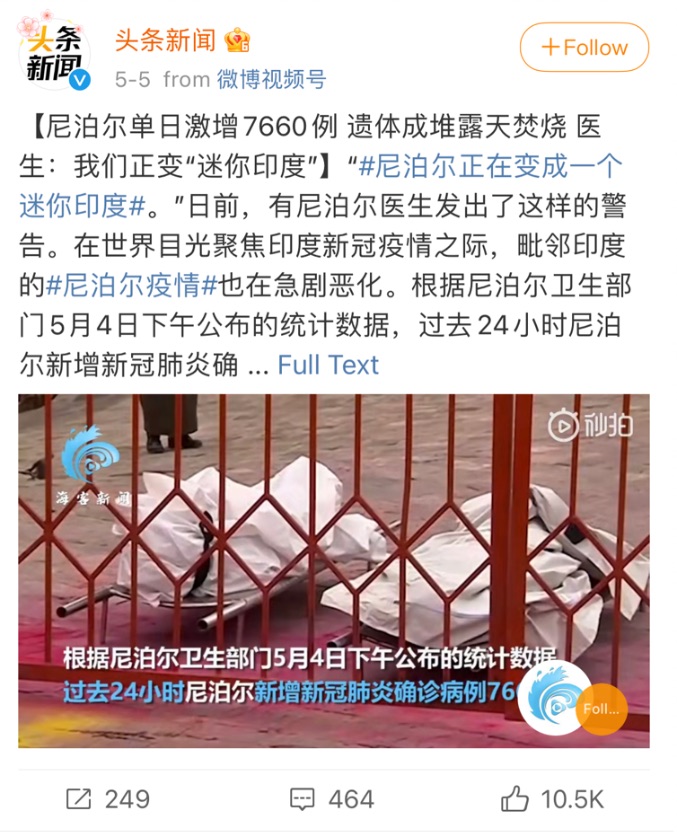 Just as the western media’s concern about Nepal’s pandemic is largely limited to Mt Everest, the Chinese social media focus is India-centered.