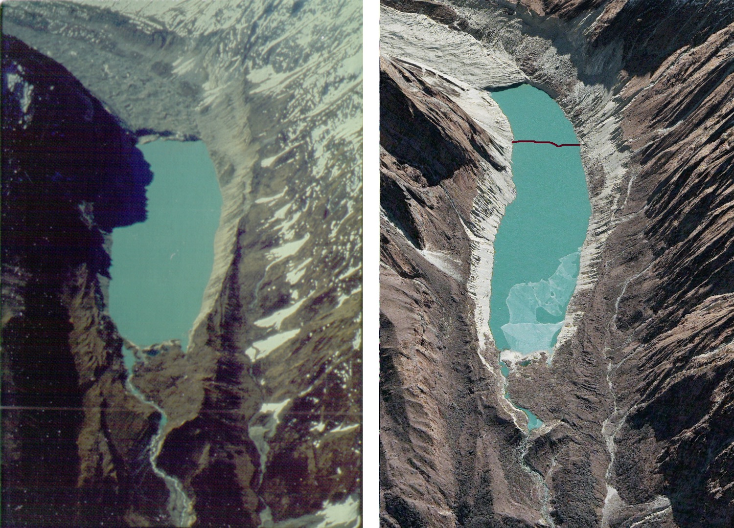 Till the 1960s, the Imja Glacier near Mt Everest had only a few melt-pools. Since then, the ice has been replaced by a lake nearly 2km long, 600m wide and up to 150m deep. The ice is receding 70m a year.