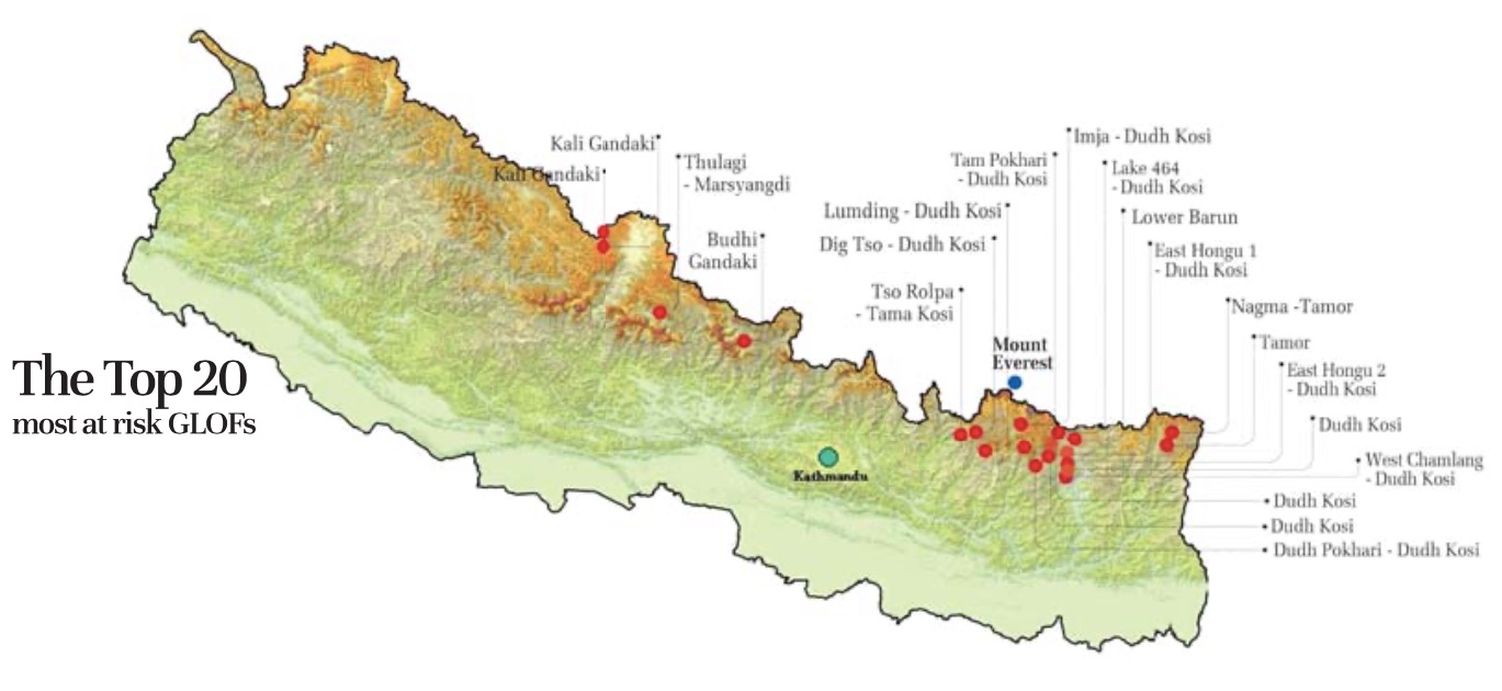 Of the 47 very dangerous lakes that threaten Nepal’s valleys, 25 originate in glaciers in Tibet. Since 1977, there have been at least 20 GLOFs of which 14 were caused by glacial lakes in Nepal bursting, and the rest were in China.