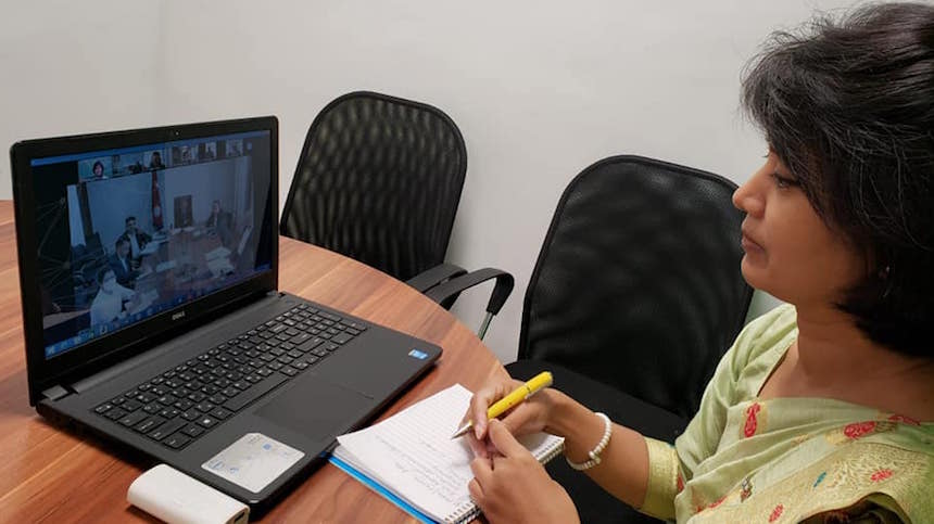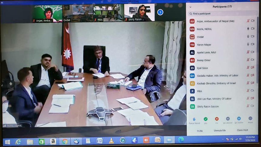 A Zoom Meeting between officials from Nepal and Israel on the recruitment of 500 Nepali caregivers through a government-to-government mechanism. Nepal's Ambassador to Israel Anjan Shakya is at right. Photo: EMBASSY OF NEPAL, ISRAEL.