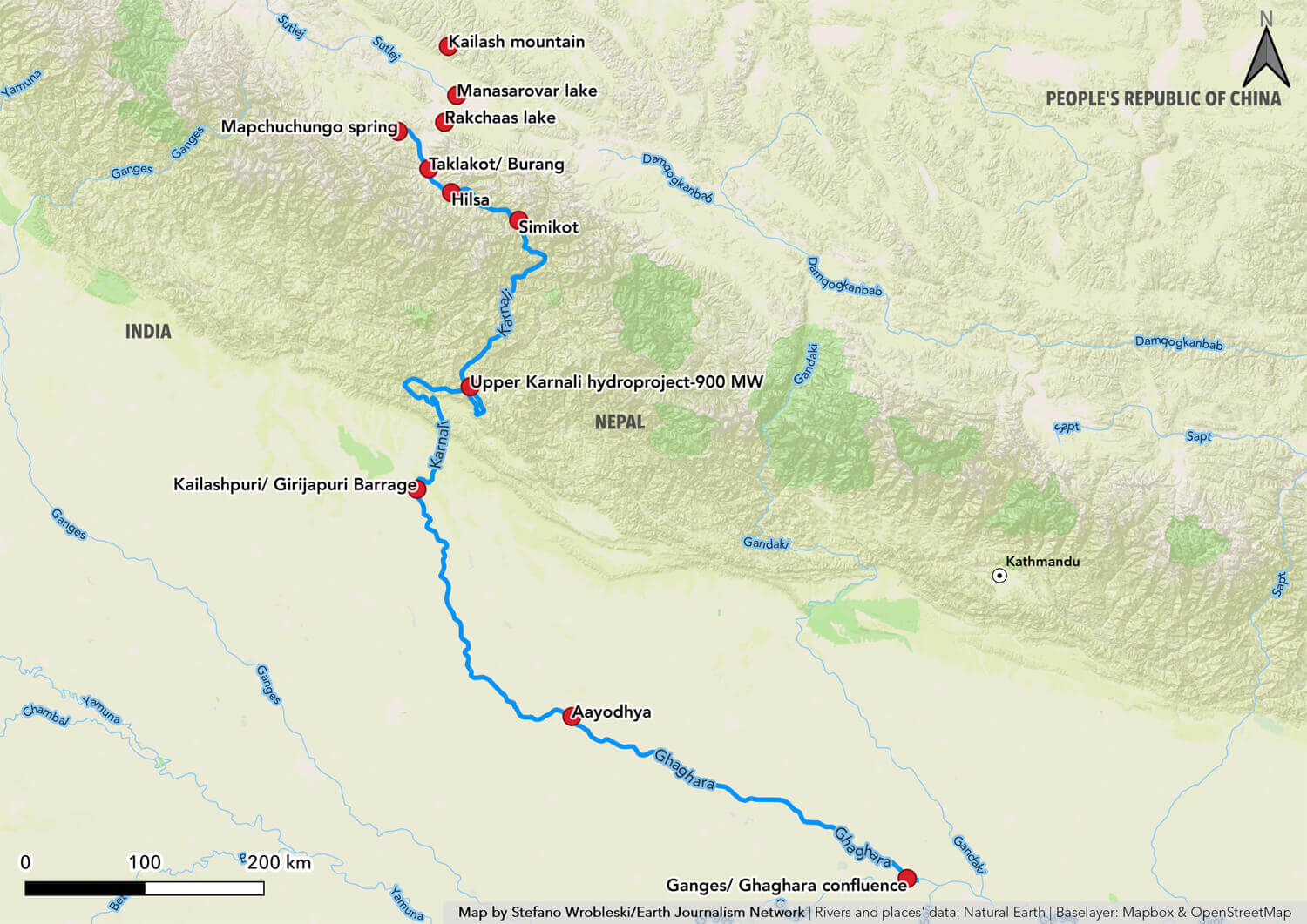 The scale of potential flood threats along the Karnali River is clear from the large embankments constructed in the traditional trading hub of Burang (Taklakot) in China, 30km northwest of Hilsa. The Mapcha Khambab becomes the Karnali once it enters Nepal.