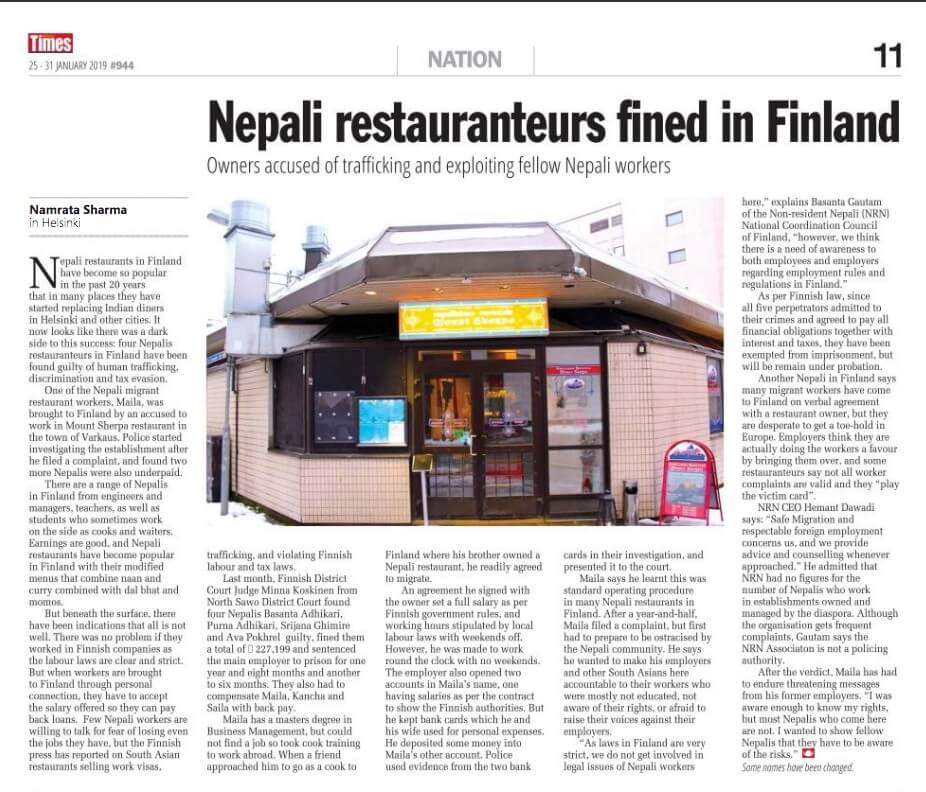 The Helsingin Sanomat report has tarnished the image of Nepal, Nepalis and Nepali restaurants in Finland, and many Finns are said to be in a dilemma about whether to eat in Nepali-owned restaurants or not. On the one hand they want to help Nepal and do not want law-abiding Nepalis to suffer, and on the other they do not want to support traffickers. The Non-Resident Nepali Association of Finland has been accused on social media of protecting powerful restaurant owners, and not helping the exploited workers. In response, the Association’s National Coordination Council released a statement this week saying it had not protected anyone accused of wrong-doing. Asked what is next, Rekola told Nepali Times: “I just hope the genuine Nepali restaurants do not suffer, and the customers return. There should also be closer contact between restaurant owners and their Finnish customers who love Nepal and Nepali food.” Helsingin Sanomat will be putting up an English and Nepali translation of the series by Paavo Teittinen on its digital edition this weekend. (The original text of this story was updated at 10:00 Nepal Time 3 April)