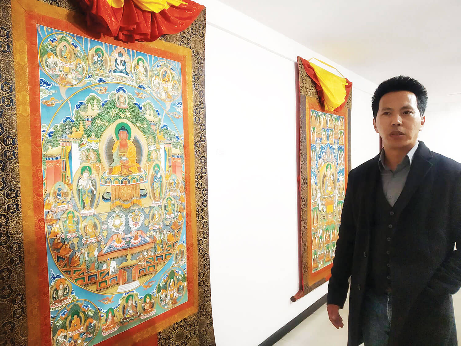 There are, however, many ways to distinguish artistic works of various Himalayan traditions. Chief guest Rinpoche Tsepri Lopan Tulku pointed out during the exhibition’s inauguration that while Indian-influenced paintings of Buddha have his shawl going over his left shoulder and leave his right shoulder bare, Tibetan paintings have the shawl coming over the right shoulder. In his talk, Rinpoche also praised the two artists for using original stone colours and real gold in the paintings’ backgrounds. “I am not saying this just to flatter them, but because they are really good and represent the ancient art well,” he said.