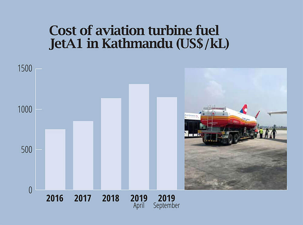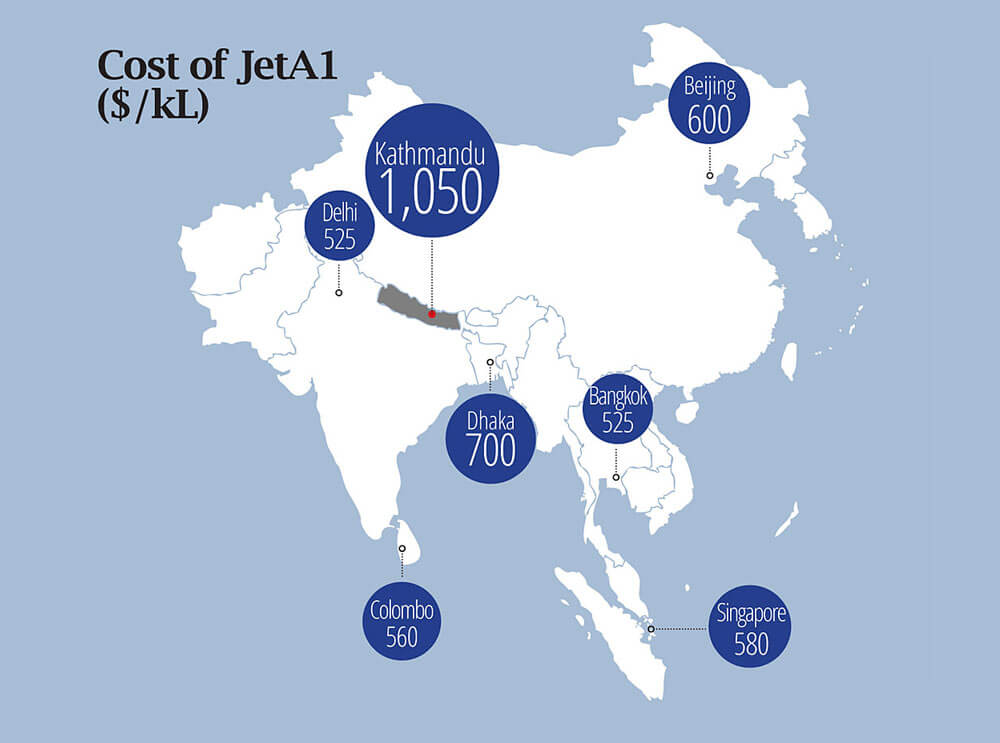 A Nepali Times survey shows the price of ATF JetA1 at Kathmandu airport this week was US$1,050 per kilolitre (kL), almost double the cost in New Delhi and Bangkok ($525/kL) and considerably higher than Beijing ($750/kL). (See chart.)