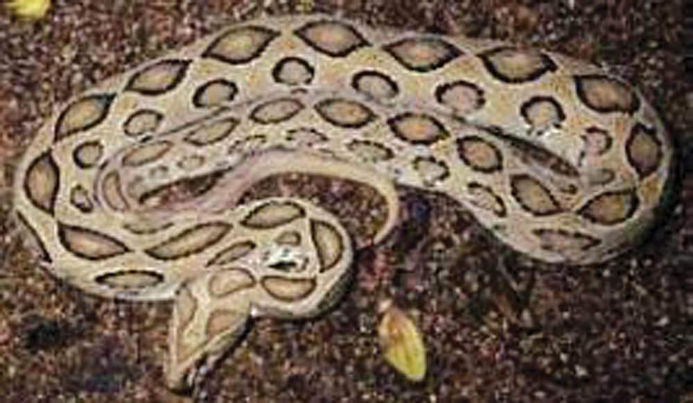 Russel Viper (Daboia russelii) is one of the most dangerous snakes in Nepal, found in the Tarai only. Its head is covered by numerous small symmetrical, oval scales, it has a long tail and long venom fangs that fold back into its mouth.