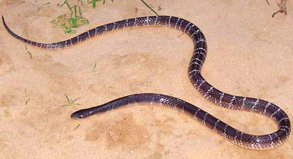Common Krait (Bungarus caeruleus), Greater Black Krait (Bungarus niger), Lesser Black Krait (Bungarus lividus) and Wall’s Krait (Bungarus walli) are the most common and dangerous causes of snake envenoming in Nepal. They differ from all other snakes in having one row of hexagonal scales along the middle of their back from neck to tail, which are much larger than other scales. Active at night, some victims do not know they have been bitten while asleep. Respiratory paralysis can kill even after 12 hours. Found up to 1,450m.
