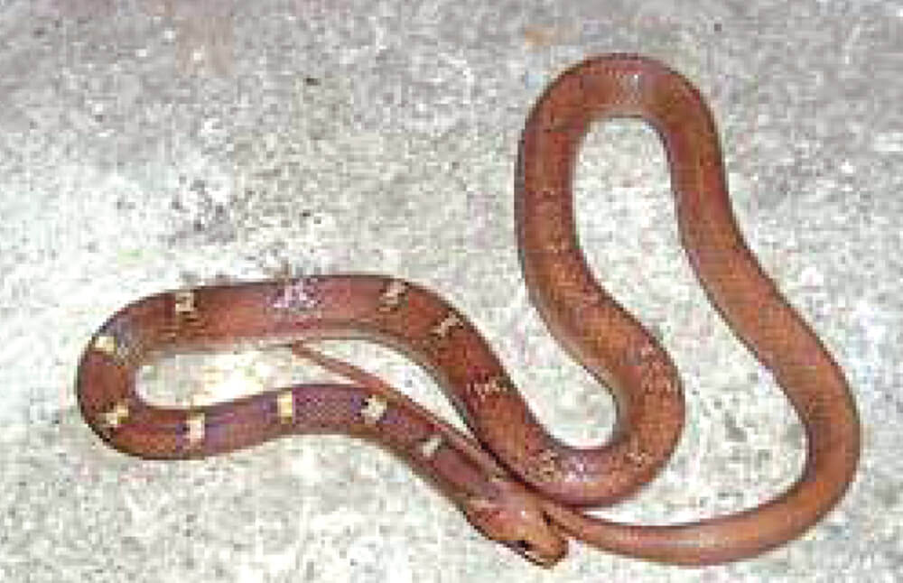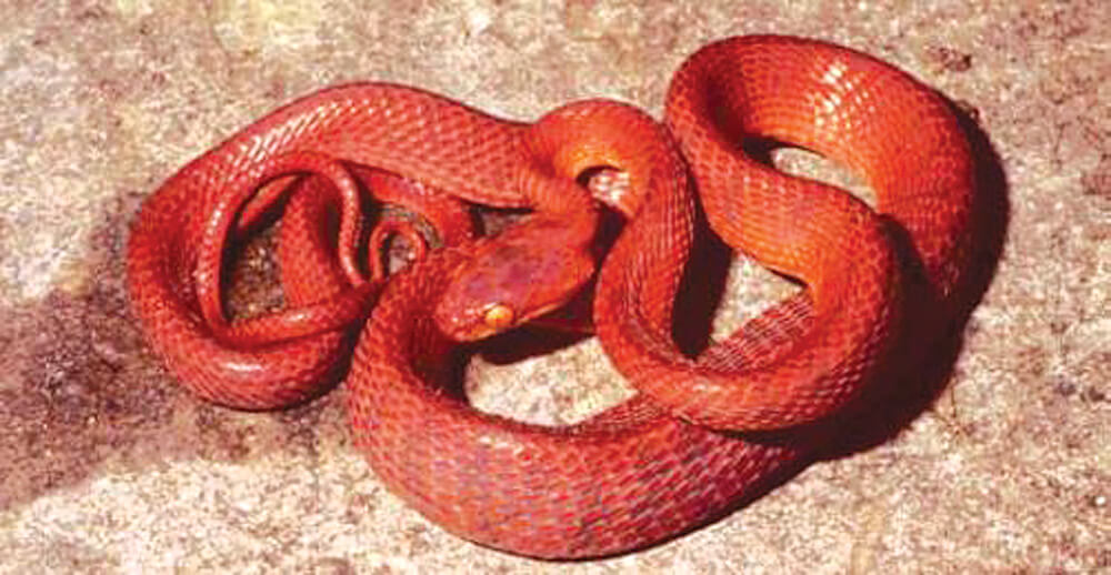 Tawny Cat Snake (Boiga ochracea) are widely distributed in the Tarai and mid-hills. They are often reddish brown and active at night, but unlike Kraits are not venomous.