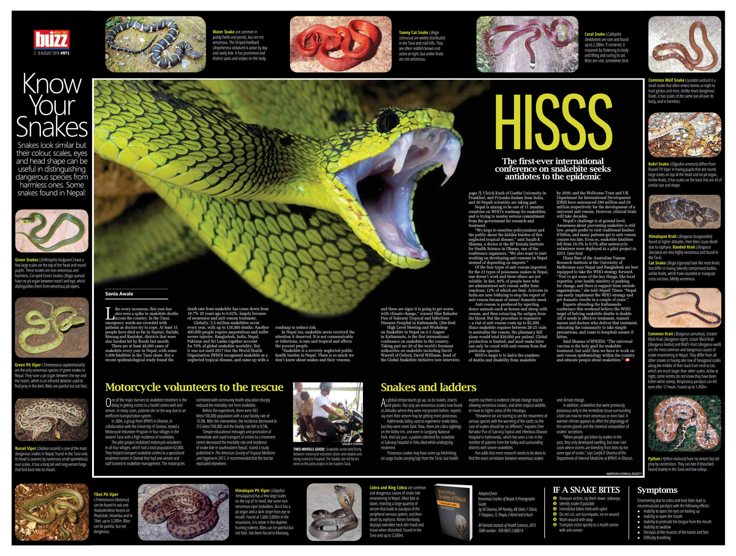 High Level Meeting and Workshop on Snakebite in Nepal on 2-3 August in Kathmandu, is the first international conference on snakebite in the country. Taking part are 20 of the world's foremost authorities on snakebite including David Warrell of Oxford, David Williams, head of the Global Snakebite Initiative (see interview, page 7), Ulrich Kuch of Goethe University in Frankfurt, and Priyanka Kadam from India, and 50 Nepali scientists are taking part.