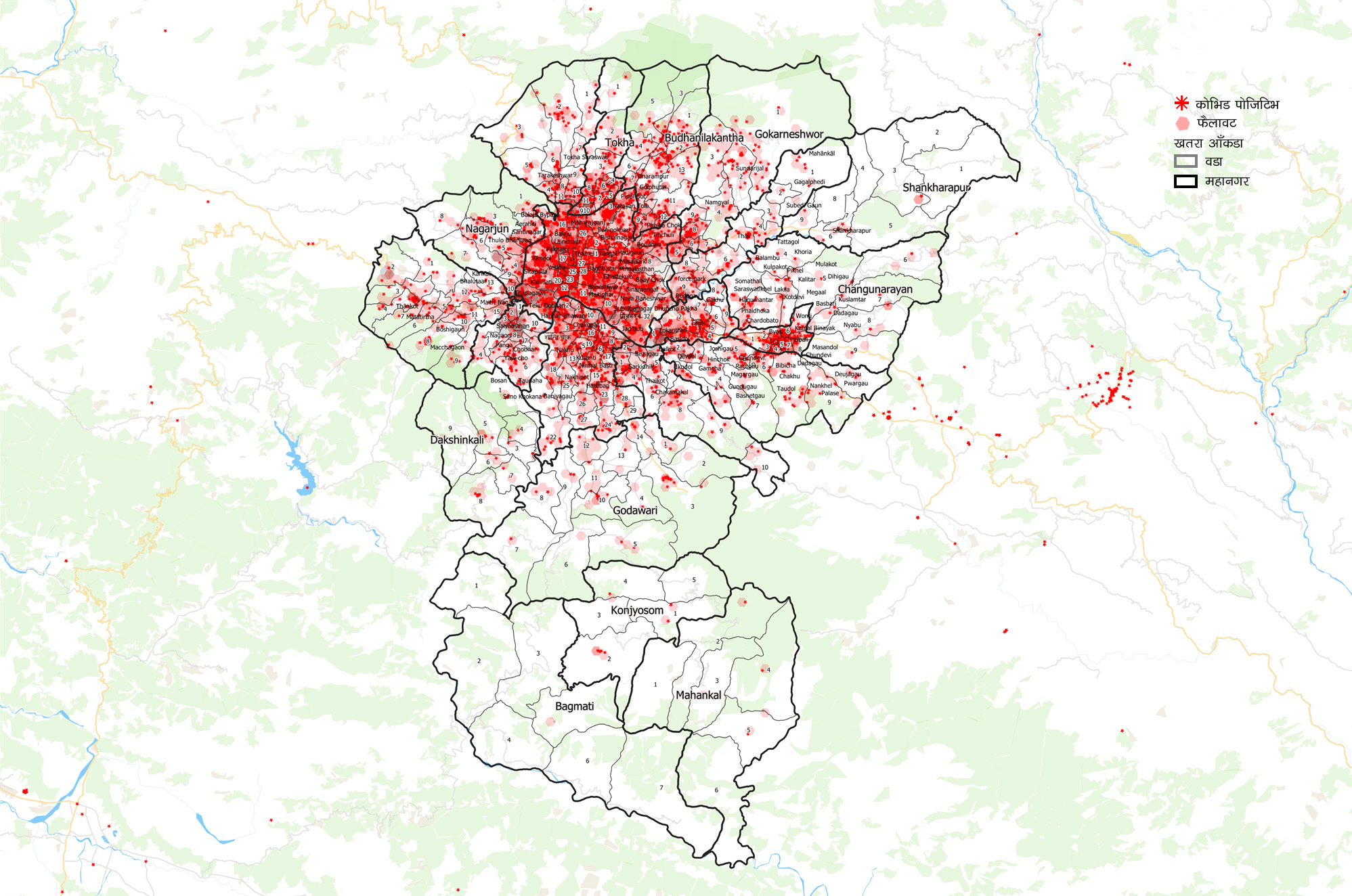 With the Dasain festival two weeks away, Kathmandu residents appear to be forgoing safety measures as they crowd at markets to shop, but the mpas provide a sobering reminder of how extensive the spread is.