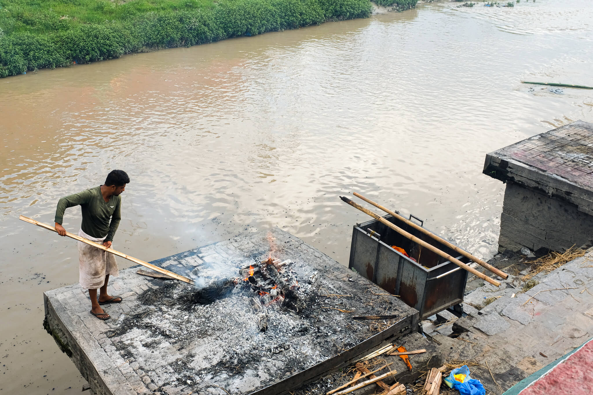 Macha Bhai’s experience with contamination in the Bishnumati was the moment he says he realised the sacred river no longer held its religious significance. He too uses water sourced from a tank at Kankeshwori Temple for his daily puja. While changes like this are upsetting to Chudamani, he says that despite his role as a priest, he and the others in his lineage profession “cannot do anything about it” and that he too limits his exposure to the once sacred water.