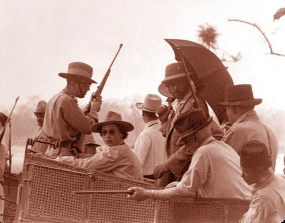 That encounter followed the infamous royal hunt as the guest of King Mahendra in the lavish Meghauli camp in which the Duke diplomatically bandaged his trigger finger so as not to have to shoot any rhinos or tigers – hunters were evolving into conservationists. Photos show the shooting party perched in elaborate basketwork elephant howdahs engraved with regal crests, which can still be found gathering dust in the Bhimphedi hatisar.