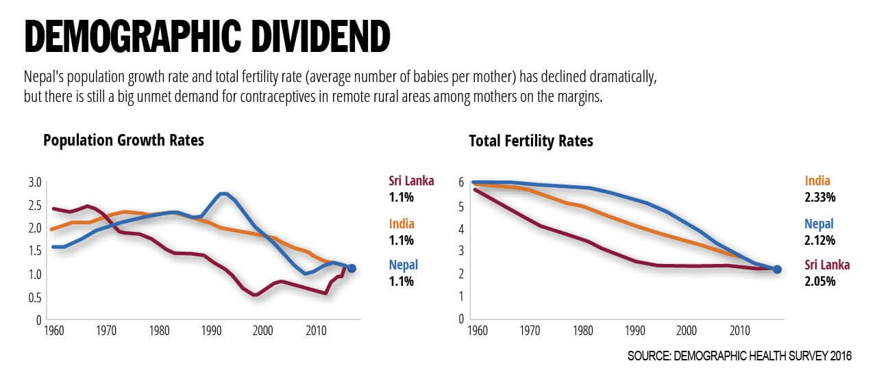 Nepal’s population clock will touch 30 million next month, but the country’s falling fertility rate means that population will stop growing in three decades after it reaches 37 million. A Nepali woman on average had 6 babies in the 1960s, now she has 2, which is below the population replacement level.