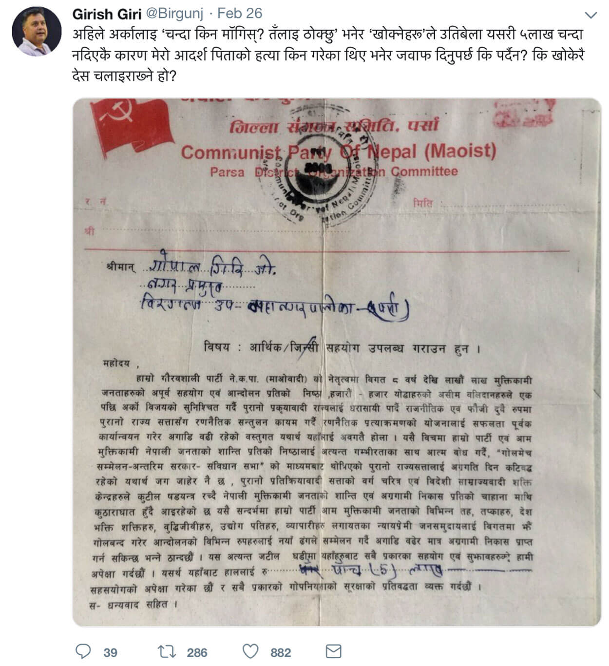 Journalist Girish Giri, whose father was killed while mayor of Birganj in 2004 for ignoring a Maoist ransom demand for Rs500,000 attached a copy of the extortion letter, and wrote in a Tweet: ‘Don’t those who are barking ‘I will whack you for extorting’ now have to answer for killing my upright father precisely for not coughing up five lakhs? Or are these rulers going to keep on barking?’ (See screenshot above)
