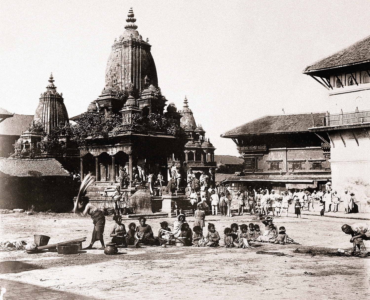 A black and white photo of Patan Darbar Square taken by Kurt Boeck in 1890 shows three shikhara-style stone temples. Only one, Chaysin Dega is still around in the original style. Materials from the other two, a Shiva temple and a Narayan temple, were used in rebuilding it.