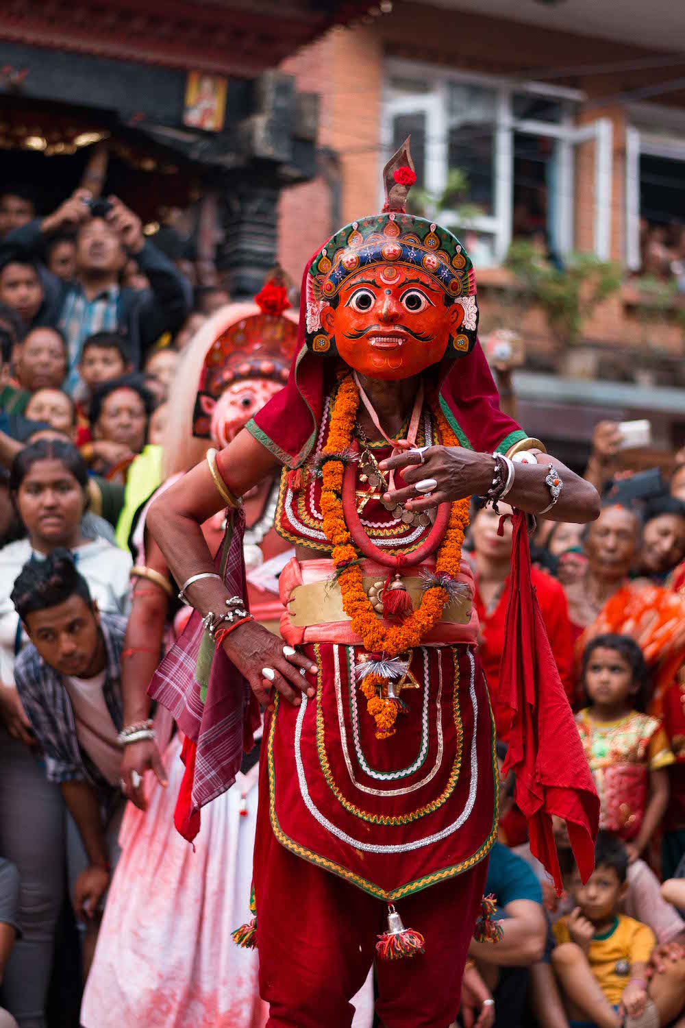 The individuals representing deities draw on heavenly power once they put on their masks. With tantric ability, they dance for four nights and three days despite all hardships. The entire time they dance, the deities and their families cannot consume anything, cannot talk, and only use hand gestures.
