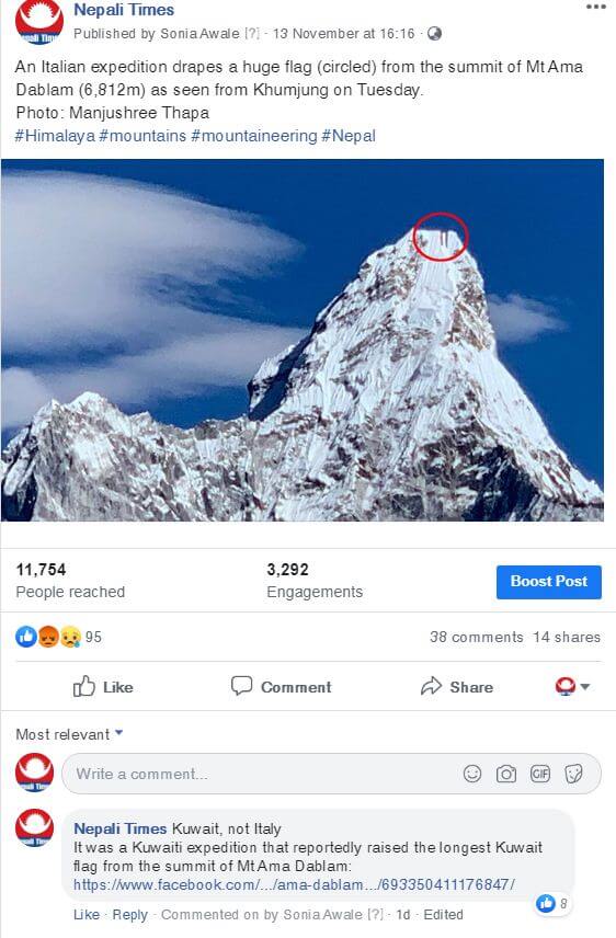 Nepali novelist Manjushree Thapa was in Khumjung on Tuesday 13 November when she noticed the flag on the summit in the afternoon, and took a photograph with her mobile. The picture was tweeted by Nepali Times, which wrongly presumed that it was a red-white-green Italian flag. It corrected the post later saying it was actually a red-white-green-black Kuwaiti flag.