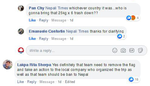 There was heated condemnation on the Nepali Times Facebook page about the flag unfurling: ‘Whichever country it was...who is gonna bring that 25kg x 6 trash down??’ asked Pan Chy.