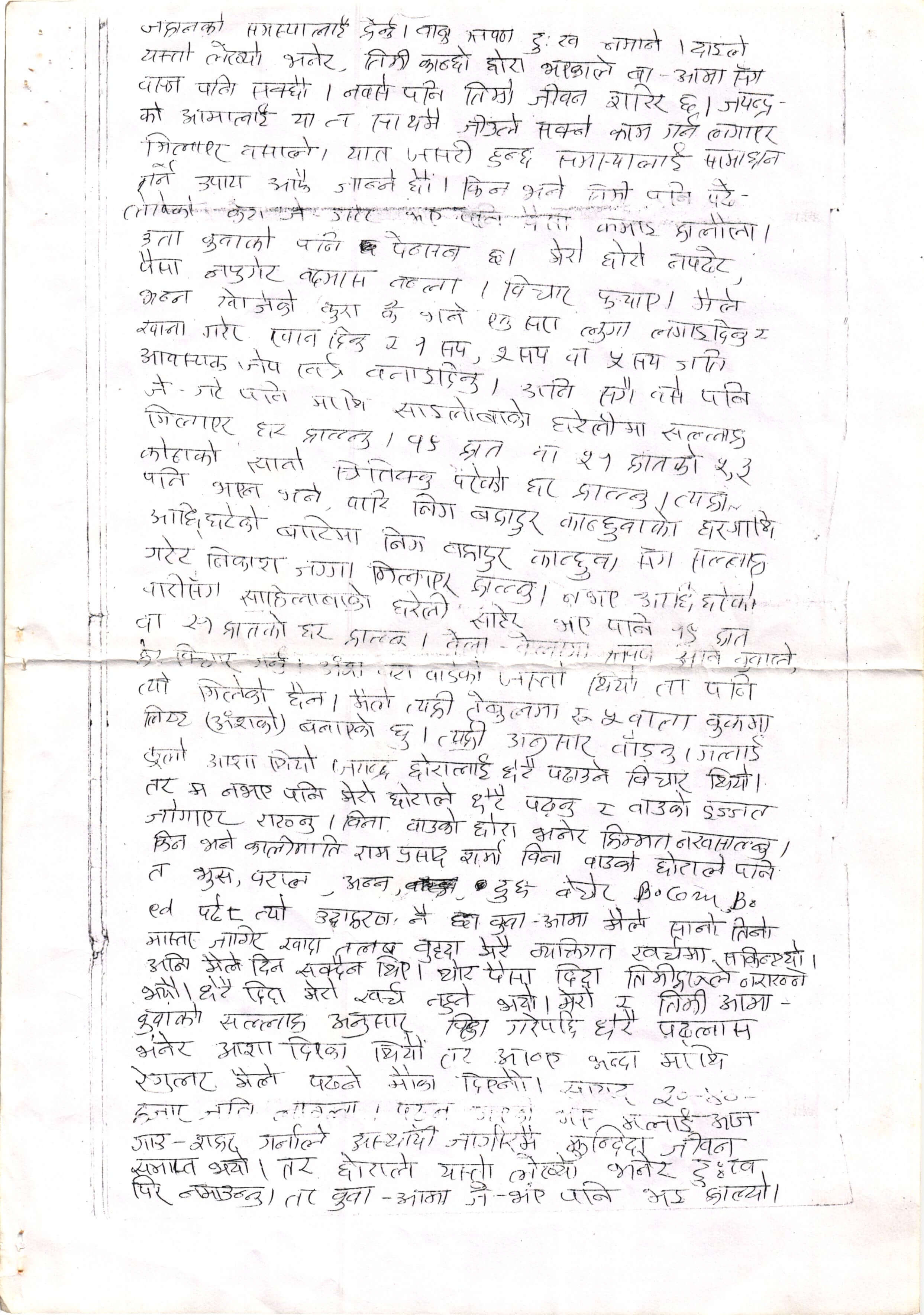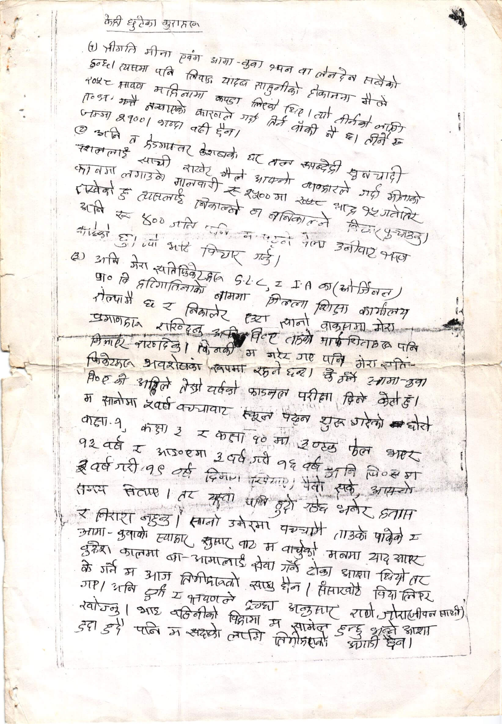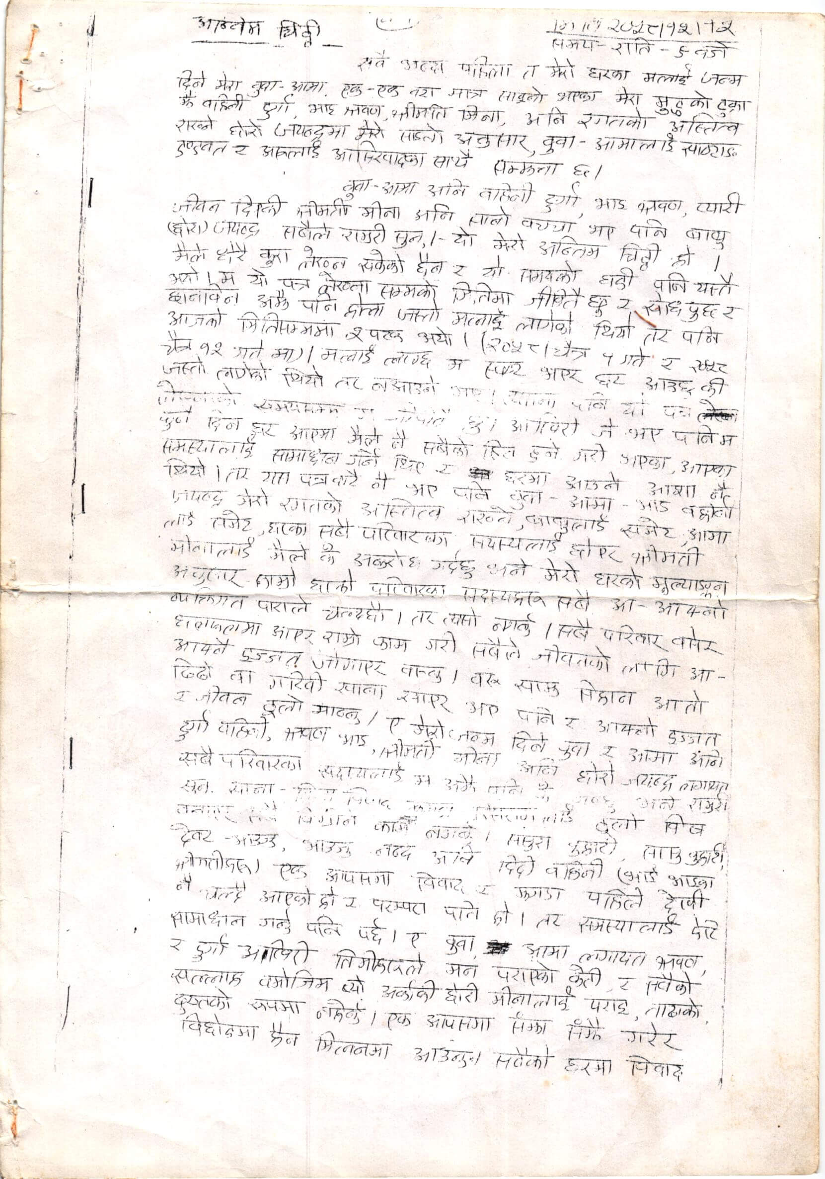 Please listen to me, my father and mother, my sister Durga and brother Shrawan, and Mina who gave birth to my son Jayendra – this is my last letter to you. I have not been able to write a lot of things, these are the times we live in. Till the time I am writing this letter, I am still alive. I expected the interrogation to continue, yet …
