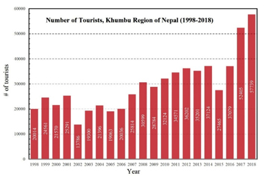 Tourism in the Khumbu region began in the early 1960s, with some of the first known records listing 20 visitors in 1964, 3,200 in 1973, and 5,000 per year in 1980. By the end of the 1980s, these number had increased to an average of 8,000 tourist per year, growing steadily throughout the 1990s to approximately 20,000 per year in 1998 despite the Maoist insurgency that started two years before.